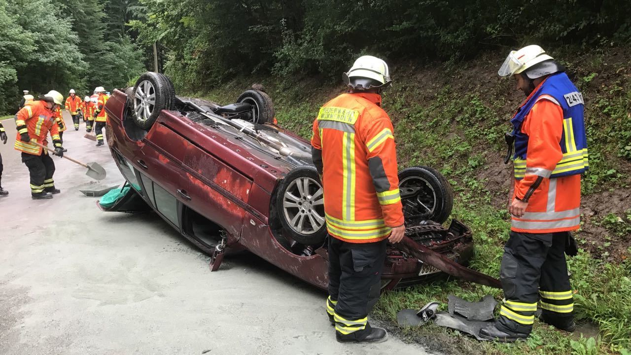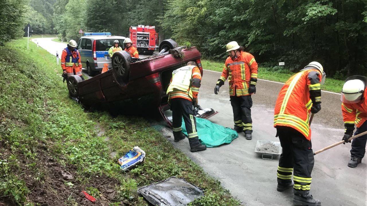 Am Donnerstag kam ein Auto auf der L 1120 zwischen Hertmannsweiler und Stöckenhof von der Fahrbahn ab und stürzte eine Böschung hinab, wo sich das Fahrzeug überschlug. © Christine Tantschinez