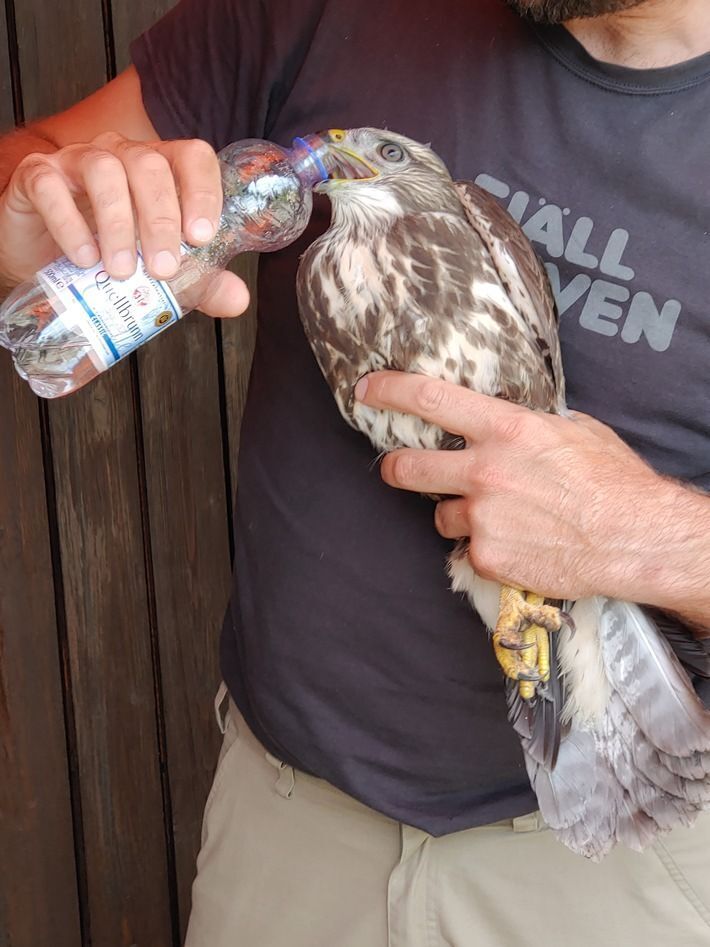 Das Tier sei bereits wohl stark dehydriert gewesen und lag hechelnd mit weit aufgerissenem Schnabel da, so die Polizei. Die Polizisten holten sich die Feuerwehr zu Hilfe, die den Bussard dann vorsichtig aus dem Netz schnitt. Ein hinzugerufener Experte einer Naturschutzorganisation untersuchte den Vogel - und gab Entwarnung. Der Bussard schien den Vorfall unverletzt überstanden zu haben. Er wurde anschließend in einen Baum gesetzt, wo er sich sichtlich erholte und wenig später in seinen nahegelegenen Horst flog. "Wir wünschen ihm alles Gute", schreibt die Polizei in ihrer Pressemitteilung.