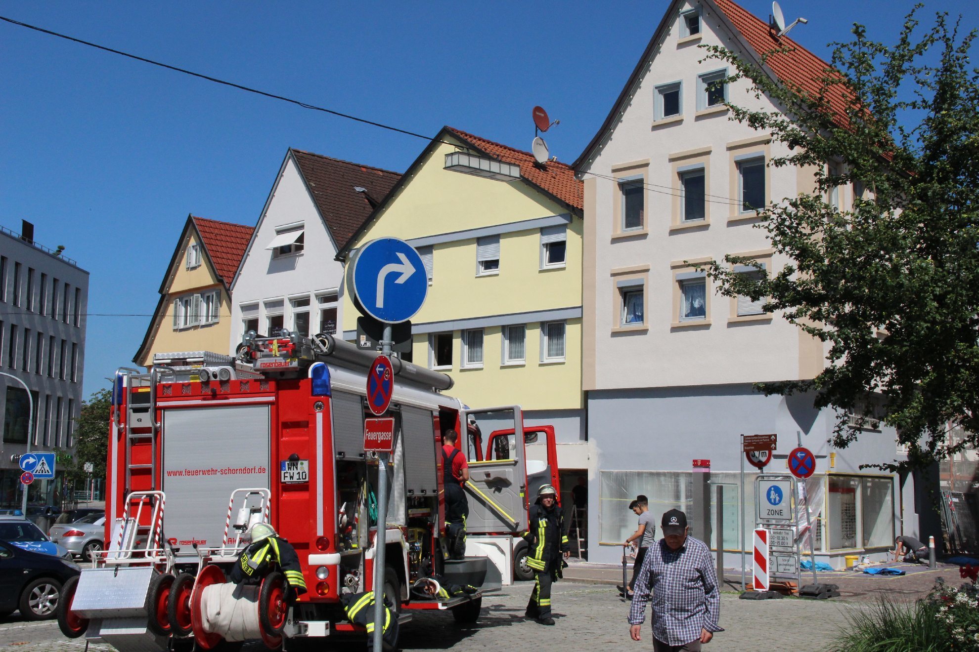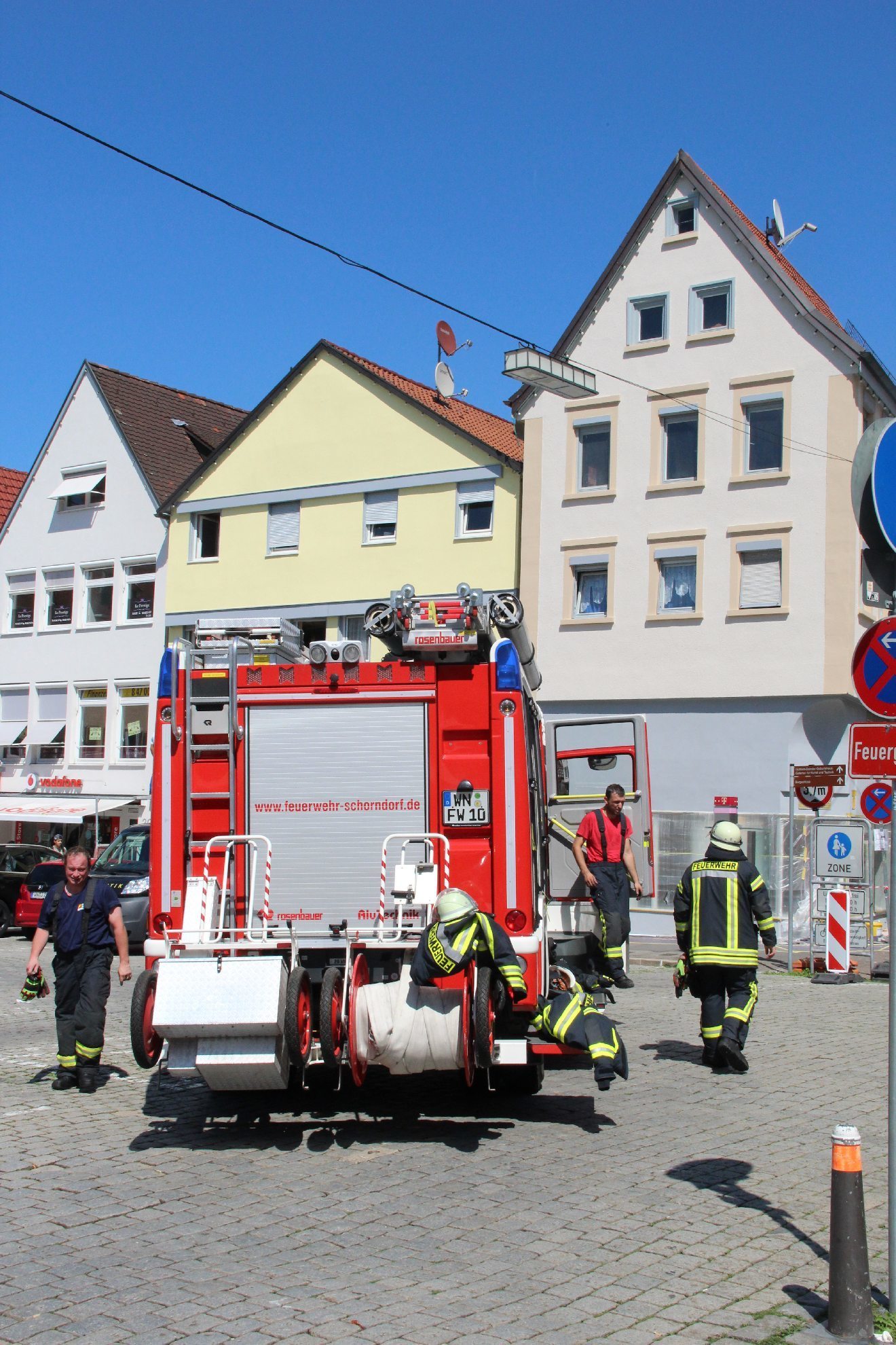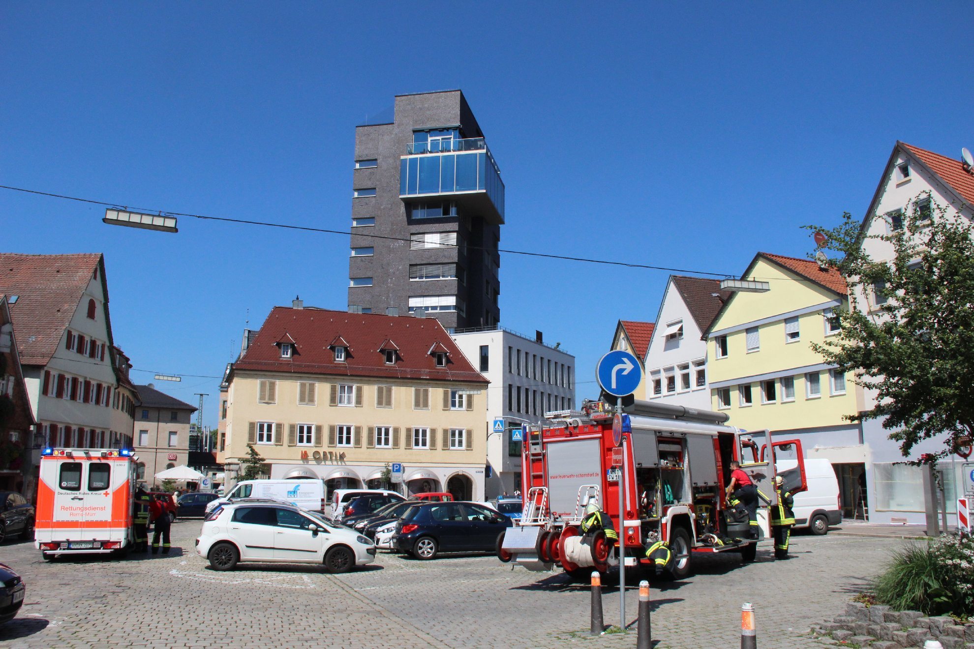 Großes Aufgebot wegen einer kleinen Ursache am Montag kurz nach 14.30 Uhr auf dem Unteren Marktplatz in Schorndorf. Die Feuerwehr musste davon ausgehen, dass im Gebäude Marktplatz 26 ein Brand ausgebrochen ist. Sie rückte mit drei Fahrzeugen und 21 Mann an, das Deutsche Rote Kreuz war auch im Einsatz. Es stellte sich heraus, dass im Hinterhaus (Höllgasse 4) ein höchstwahrscheinlich alkoholisierter Bewohner wohl mit einer Zigarette in seiner Wohnung Müll zum Glimmen gebracht hat. Er war mit einer brennenden Zigarette eingeschlafen. Noch bevor offenes Feuer entstanden war, konnte der Mann aus seiner Wohnung geborgen werden. Er musste jedoch mit Verdacht einer Rauchgasvergiftung in ein Krankenhaus verbracht werden. In der Wohnung entstand kein nennenswerter Schaden. Die Ermittlungen zum Vorfall dauern an.