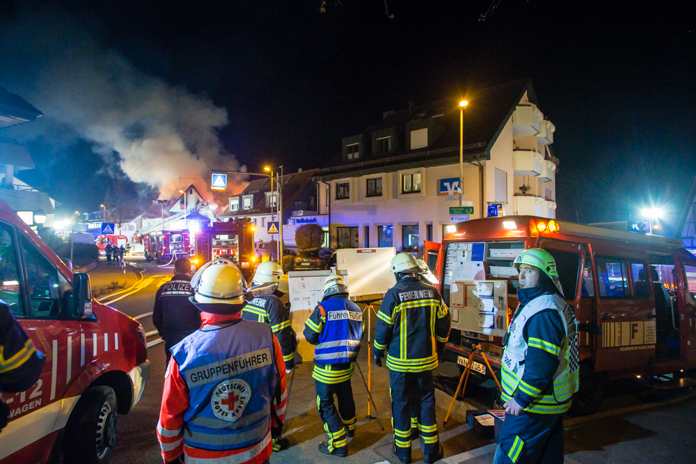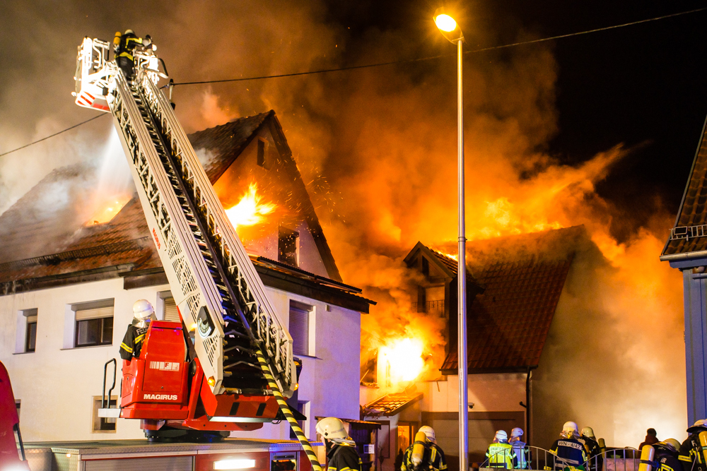 Waiblingen. Ein Großbrand in Hegnach am Dienstagabend (5.2.) zerstörte zwei Wohnhäuser. Die Löscharbeiten dauerten Stunden. Sperrung der Hauptstraße kann sich bis Mittwoch Nachmittag hinziehen.