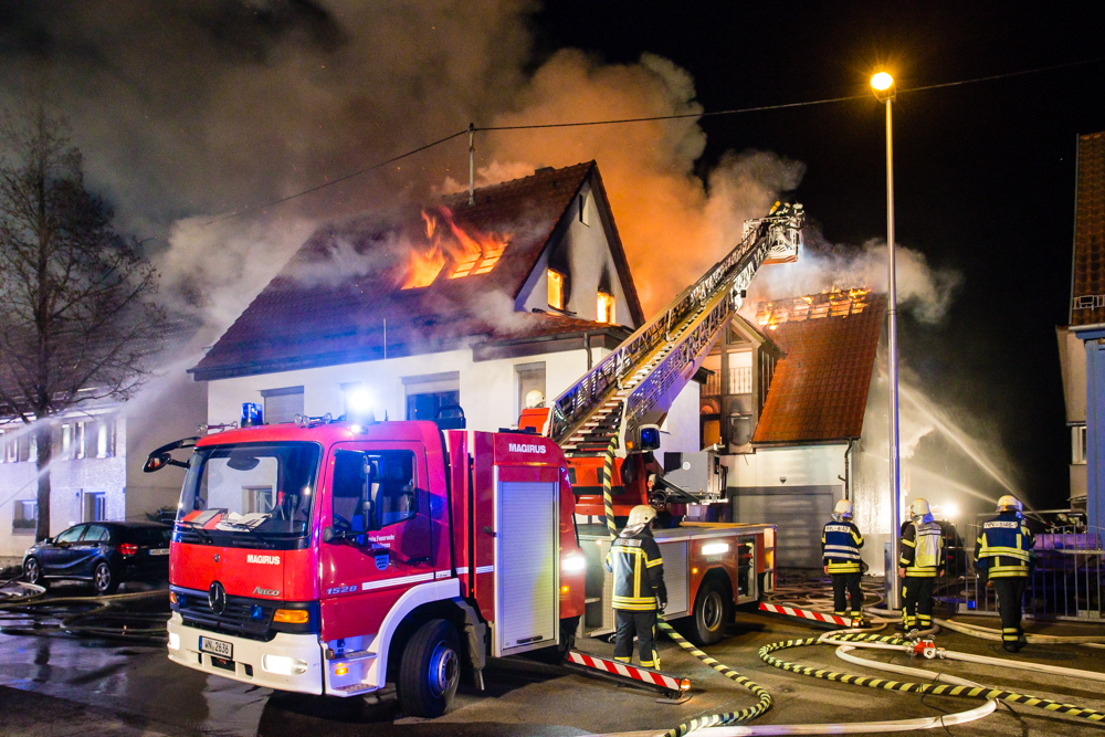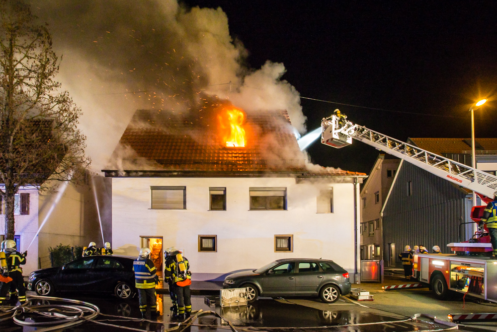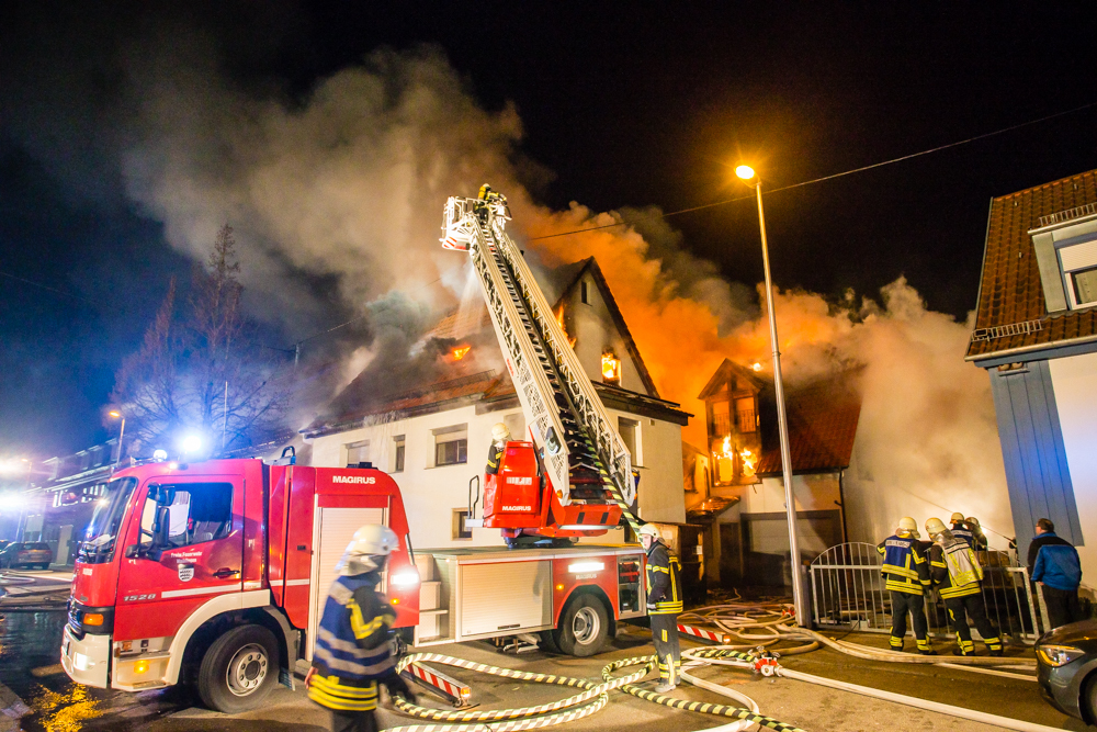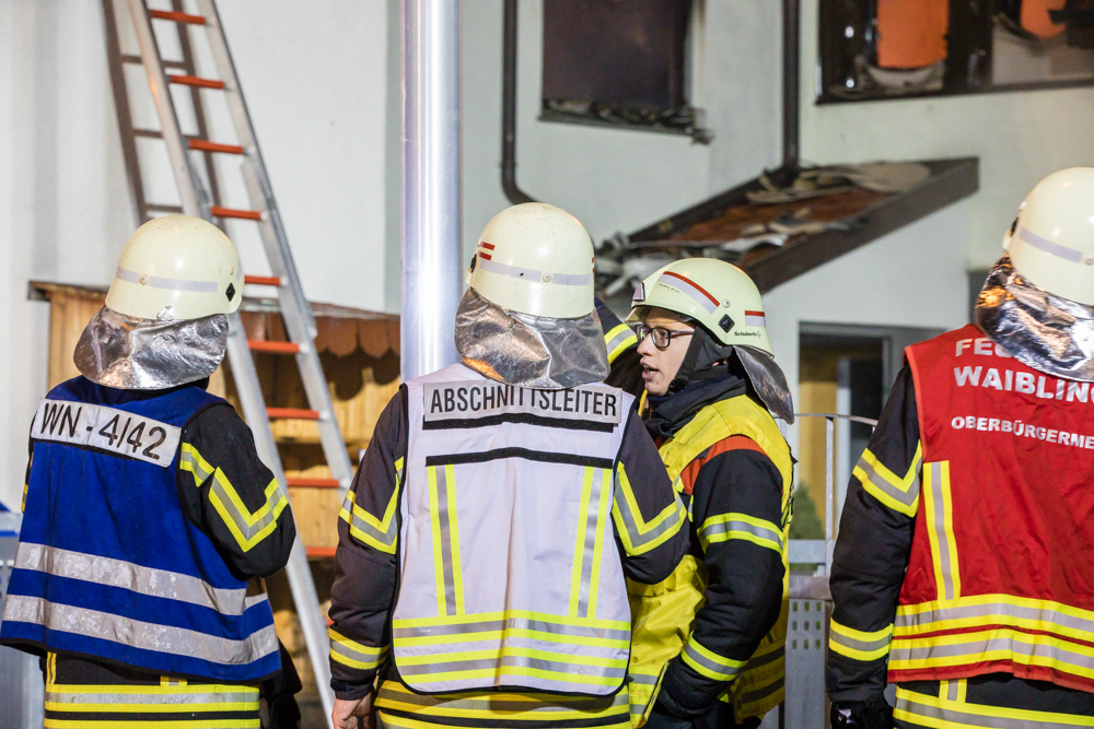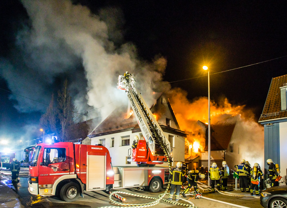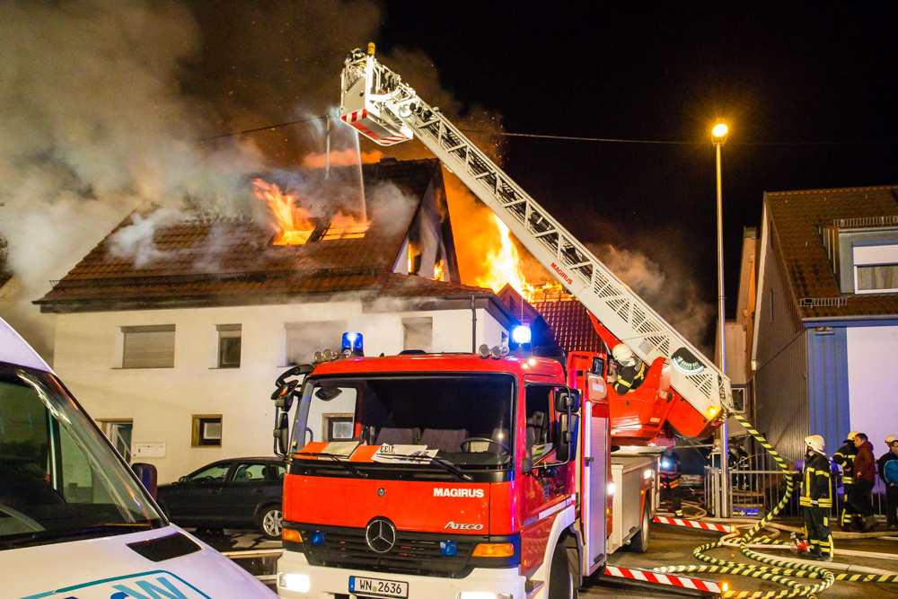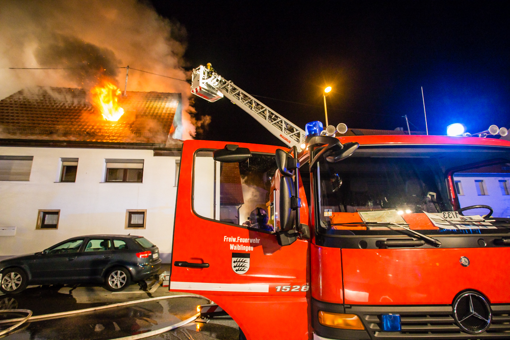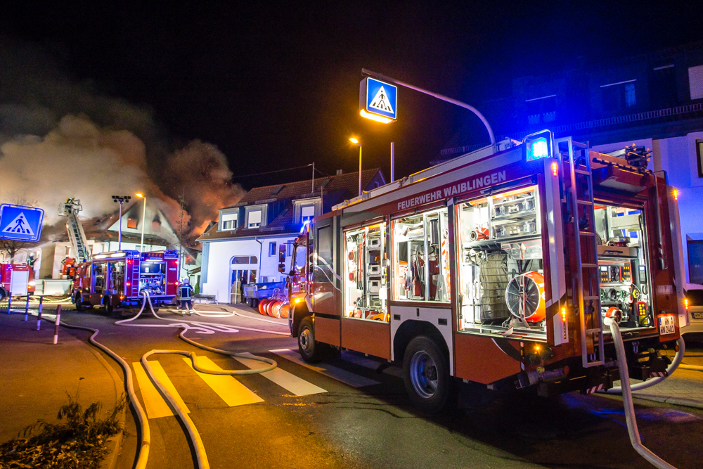 Gegen 23:25 Uhr ging bei der Feuerwehr der erste Notruf ein, Feuer in einem Wohnhaus in der Hohenacker Straße. Beim Eintreffen der ersten Fahrzeuge brannte der Dachstuhl bereits lichterloh und dehnte sich auf den Anbau aus. Die Löscharbeiten dauerten Stunden. Unterstützt wurde die Feuerwehr Waiblingen von ihren Kameraden aus Fellbach und Weinstadt.
