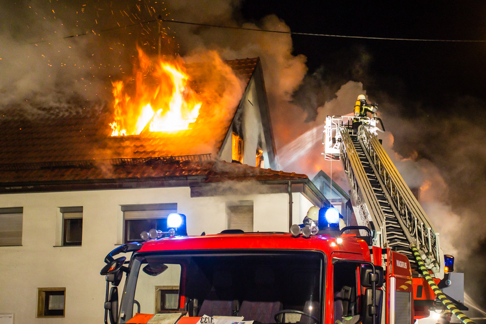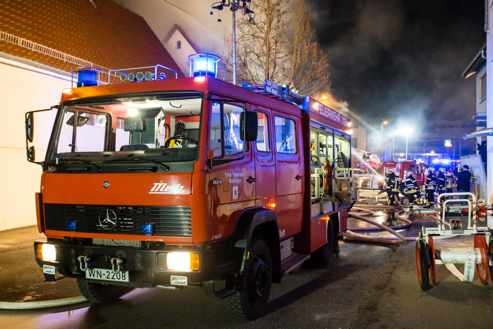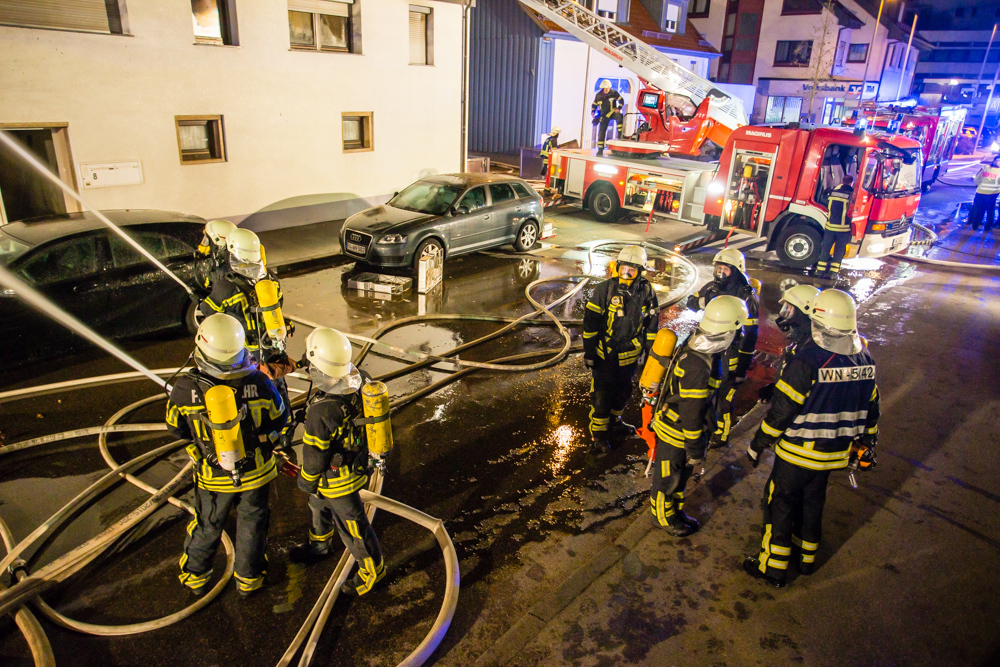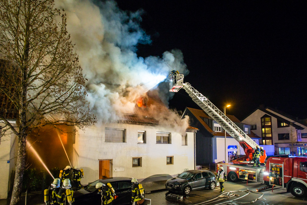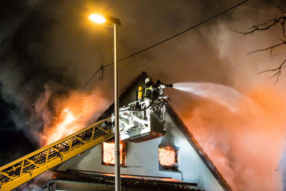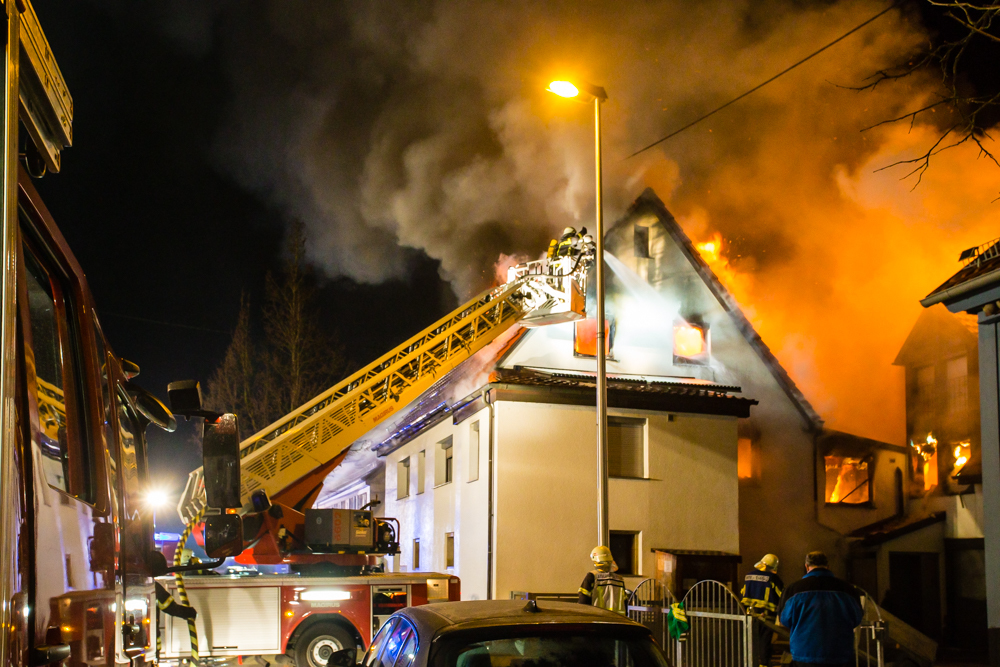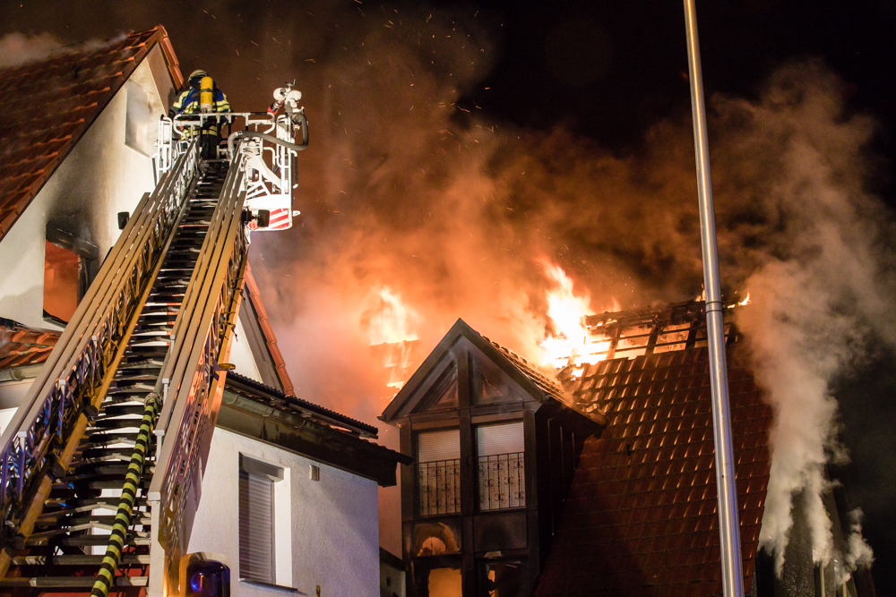 Gegen 23:25 Uhr ging bei der Feuerwehr der erste Notruf ein, Feuer in einem Wohnhaus in der Hohenacker Straße. Beim Eintreffen der ersten Fahrzeuge brannte der Dachstuhl bereits lichterloh und dehnte sich auf den Anbau aus. Die Löscharbeiten dauerten Stunden. Unterstützt wurde die Feuerwehr Waiblingen von ihren Kameraden aus Fellbach und Weinstadt.