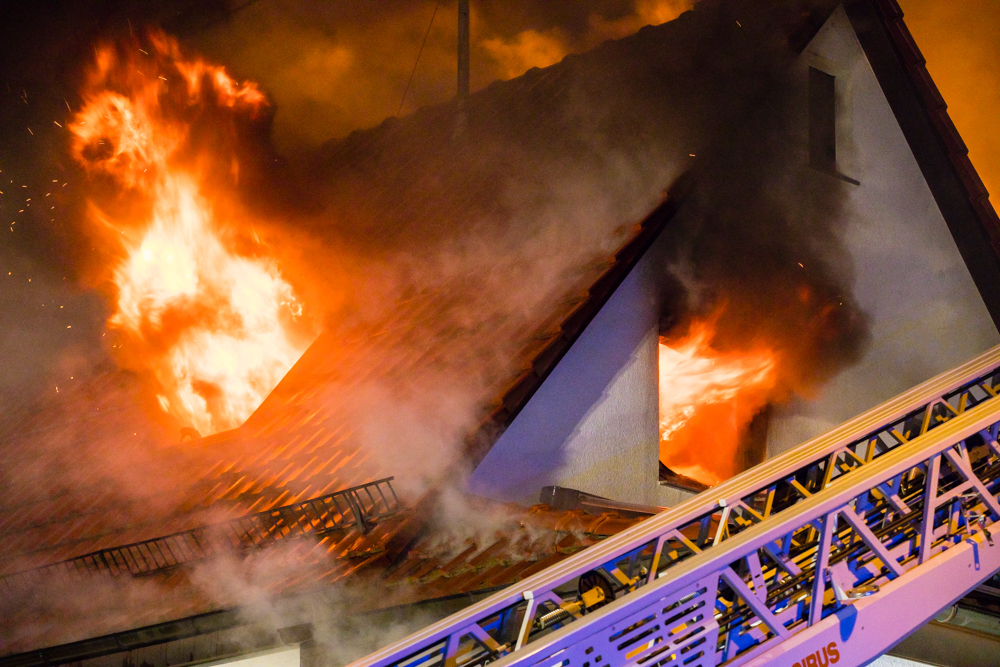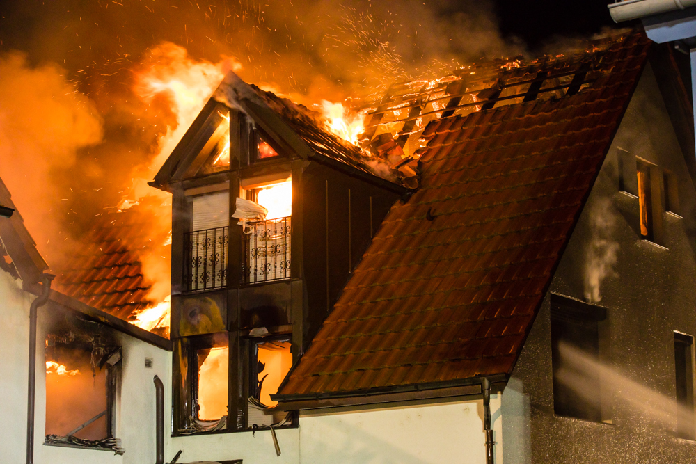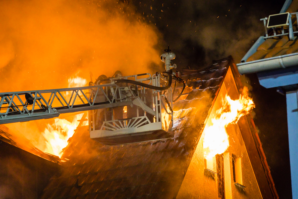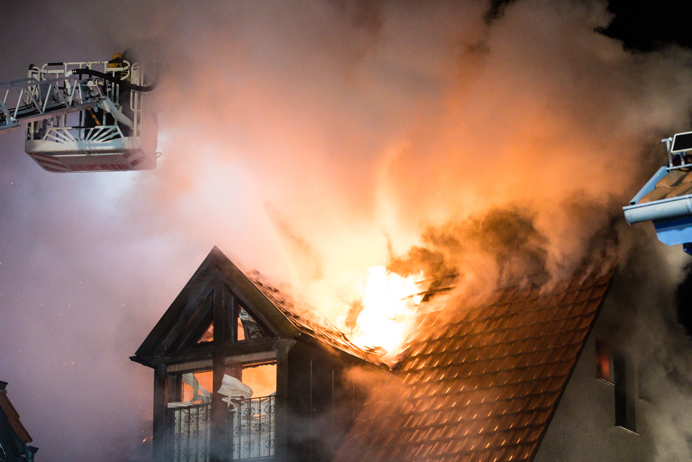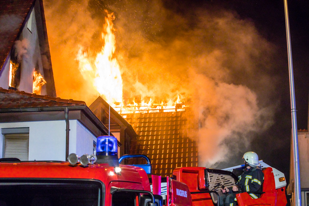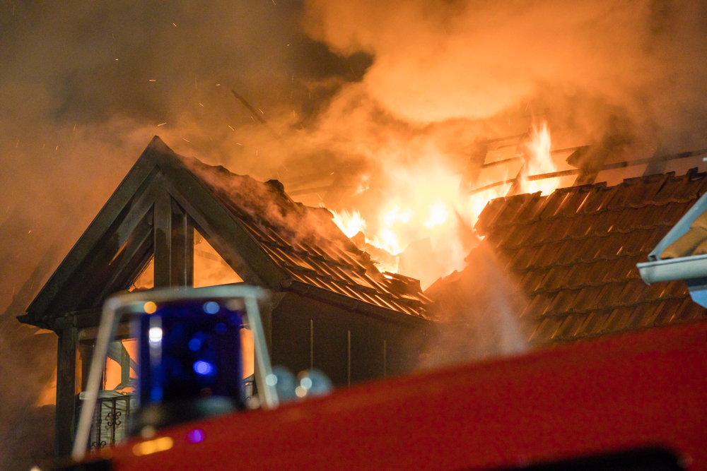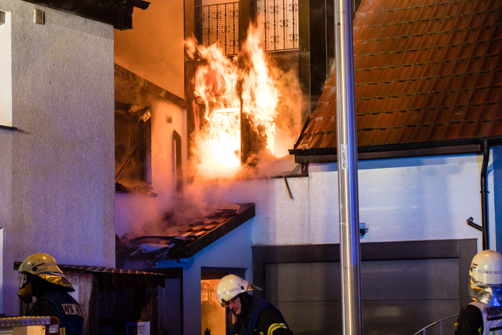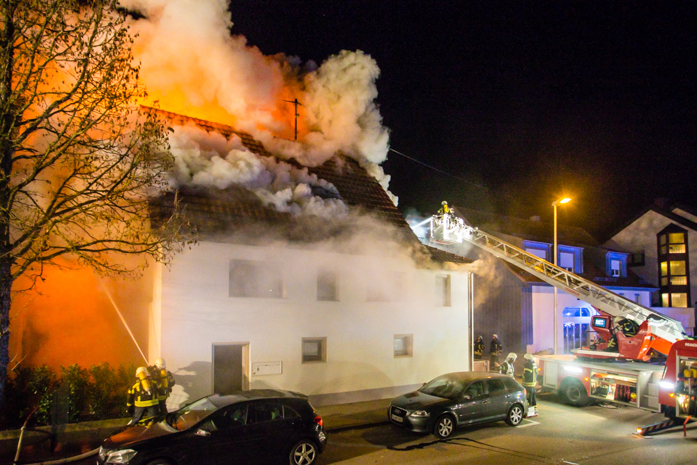 Gegen 23:25 Uhr ging bei der Feuerwehr der erste Notruf ein, Feuer in einem Wohnhaus in der Hohenacker Straße. Beim Eintreffen der ersten Fahrzeuge brannte der Dachstuhl bereits lichterloh und dehnte sich auf den Anbau aus. Die Löscharbeiten dauerten Stunden. Unterstützt wurde die Feuerwehr Waiblingen von ihren Kameraden aus Fellbach und Weinstadt.