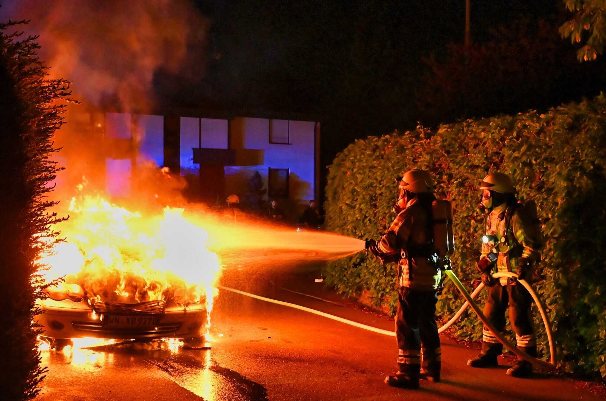 Die Feuerwehr Fellbach konnte laut Polizeibericht ein Übergreifen der Flammen auf weitere geparkte Fahrzeuge und ein angrenzendes Wohnhaus verhindern. Als Brandursache werde ein