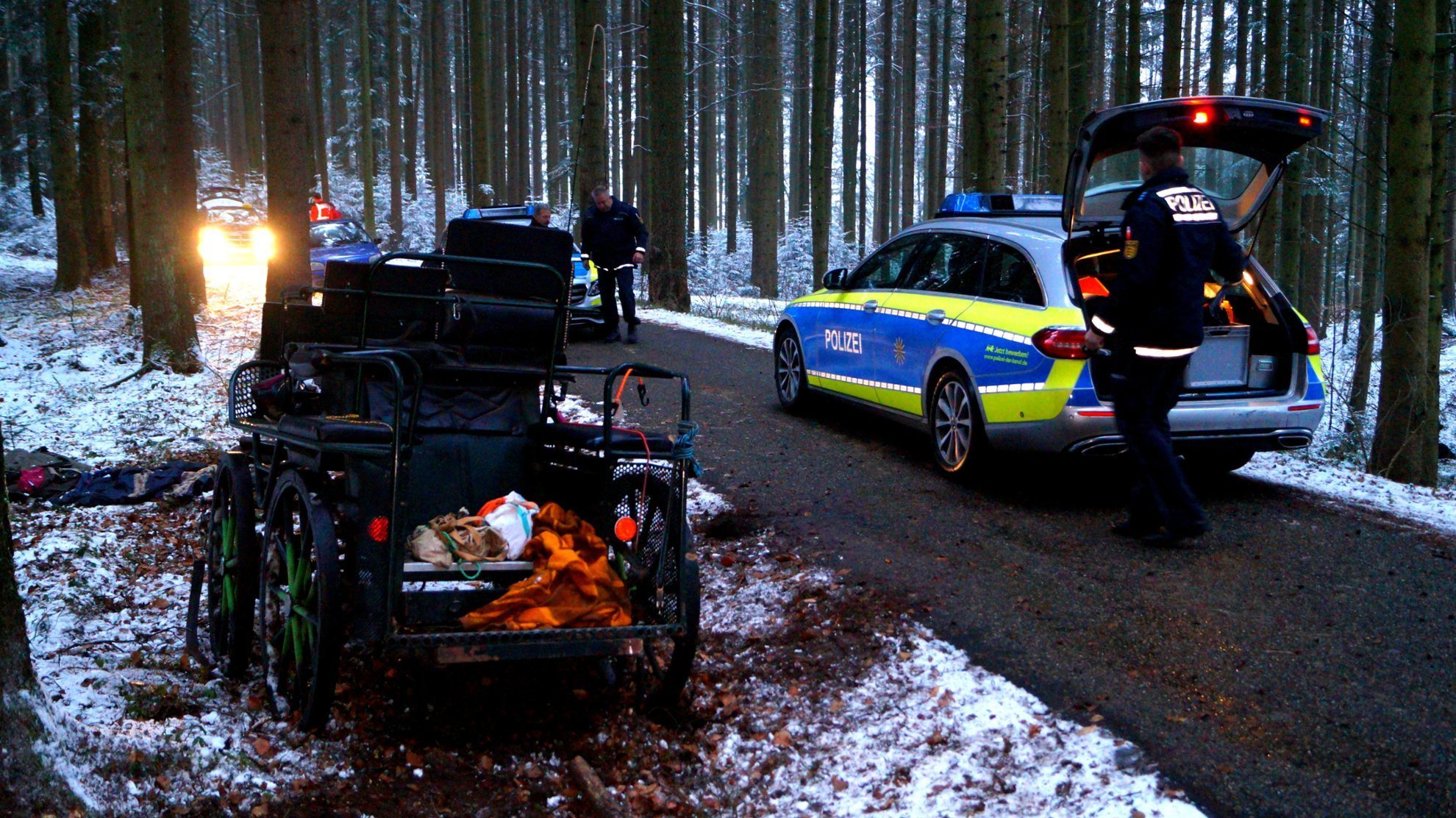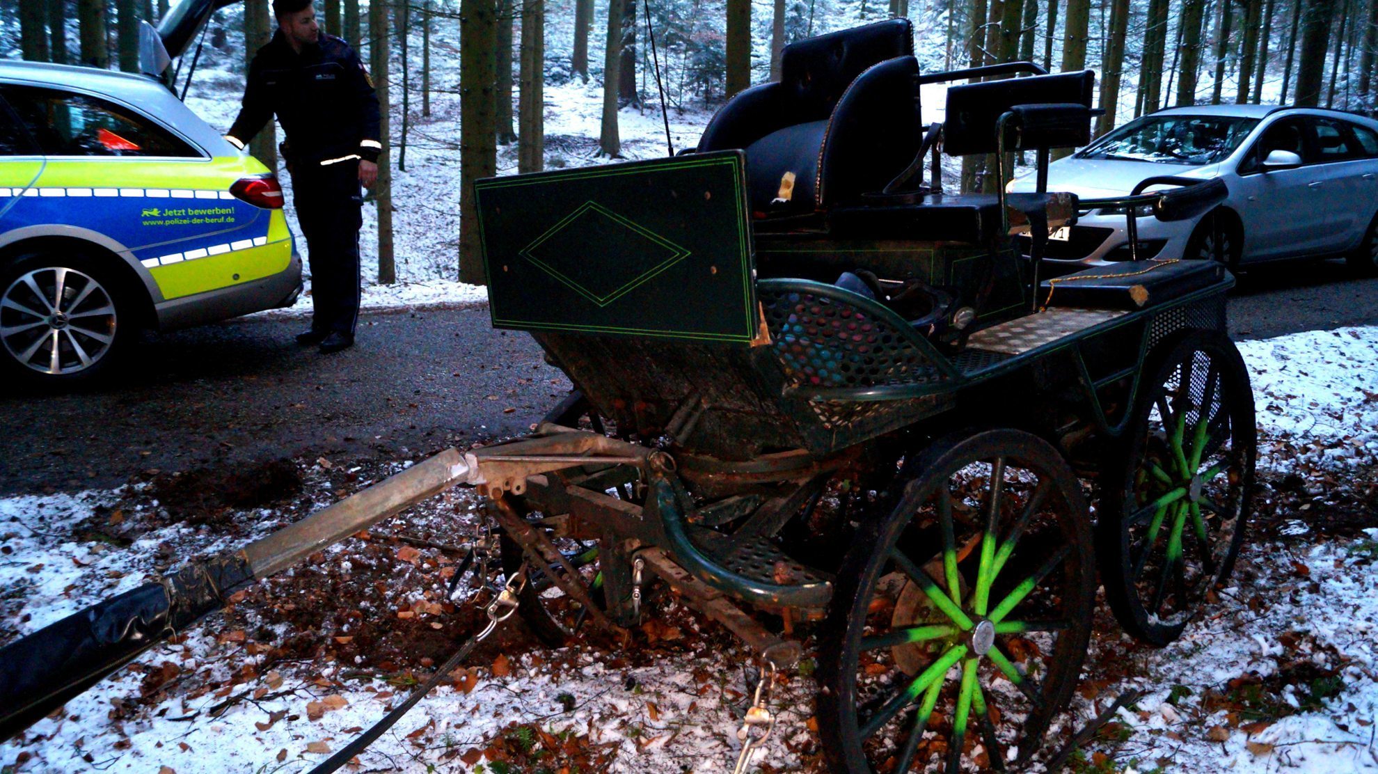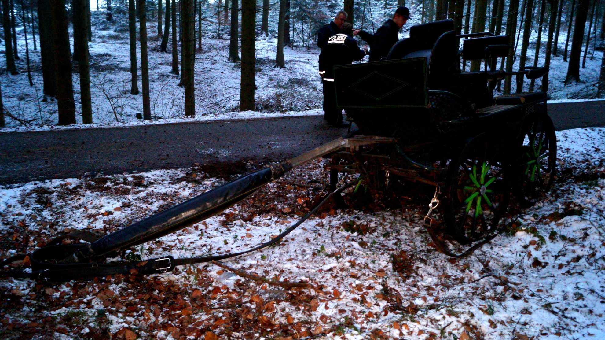 Im Bereich des Gewanns Heiligenwald prallte eines der beiden durchgehenden Pferde wenig später gegen eine Buche und zog sich hierbei tödliche Verletzungen zu. Der Kutscher wurde bei diesem Zusammenstoß vom Kutschbock gerissen und musste in ein Krankenhaus gebracht werden. Die beiden Mitfahrer blieben hingegen unverletzt. Es entstand ein geschätzter Gesamtschaden in Höhe von circa 8.000 Euro.