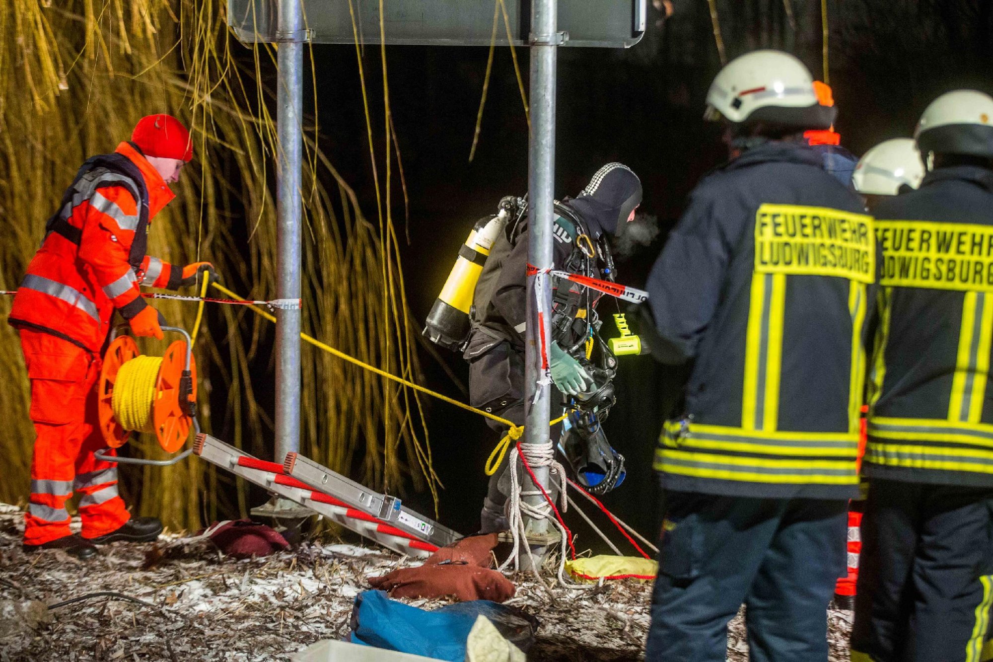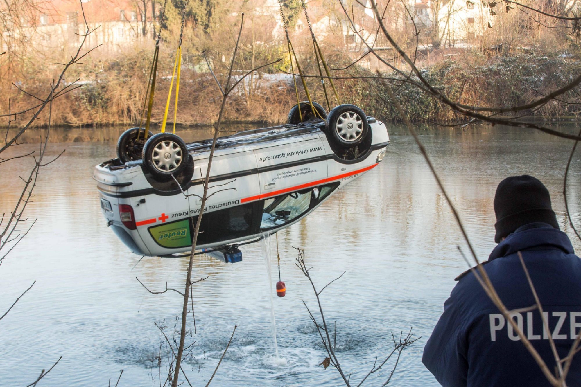 Die Hintergründe sind noch offen, aber allem Anschein nach handelt es sich um ein gestohlenes DRK-Fahrzeug, das im Neckar bei Ludwigsburg gefunden worden ist. Ein Autokran und Taucher haben das Fahrzeug am Samstagvormittag (21.1.) geborgen.