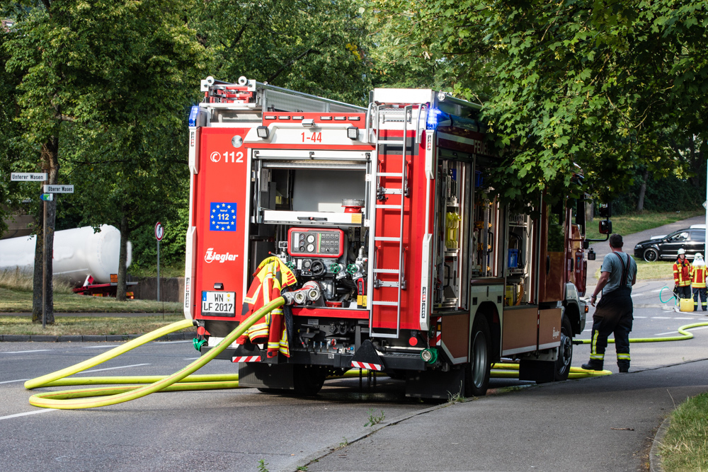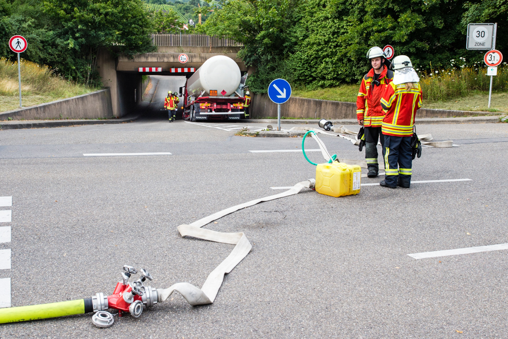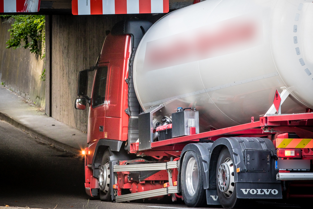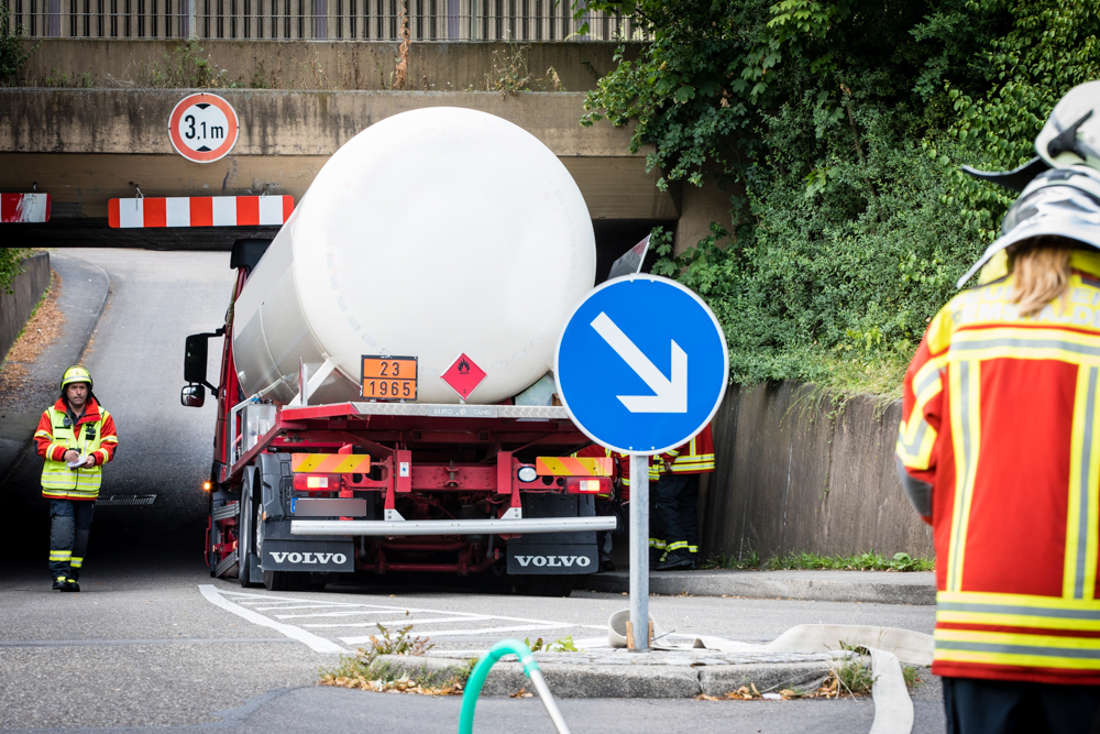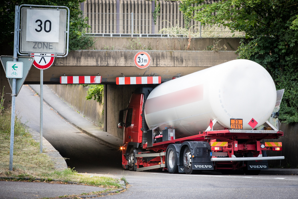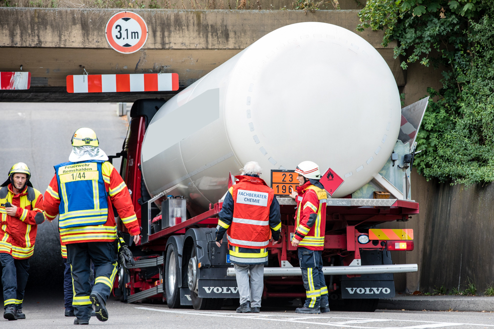 Unter der B-29-Brücke im Oberen Wasen/Ecke Rathausstraße in Geradstetten hat sich am Donnerstagabend ein Lastwagen mit Gastankaufbau festgefahren. Nach Angaben der Polizei war der Lastwagen mit Propangas und LPG beladen. Der 37-jährige Fahrer hatte vorher einen Teil seiner Ladung abgeladen. Er ist laut Polizei ortsunkundig und blieb mit seinem wesentlich höheren Gastankaufbau an der Unteführung mit ihrer lichten Höhe von nur rund drei Metern hängen. Aufgrund der Druckanzeige des Tanks und Messungen der Feuerwehr vor Ort lässt sich sagen, dass kein Gas austrat, der Tank also bei dem Unfall nicht leckschlug.