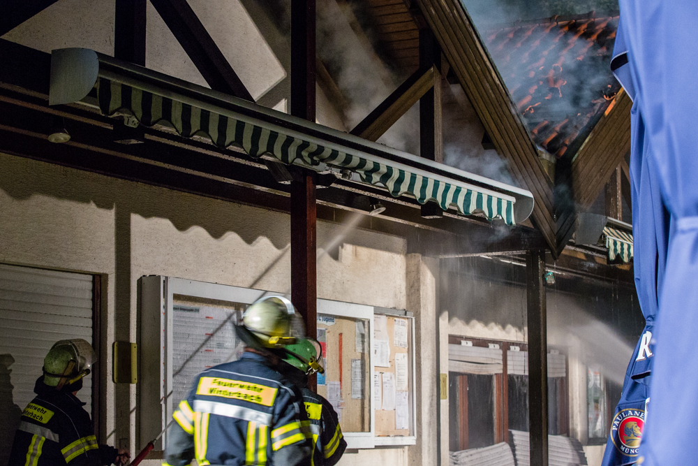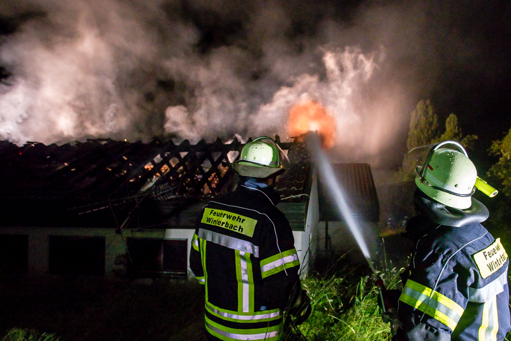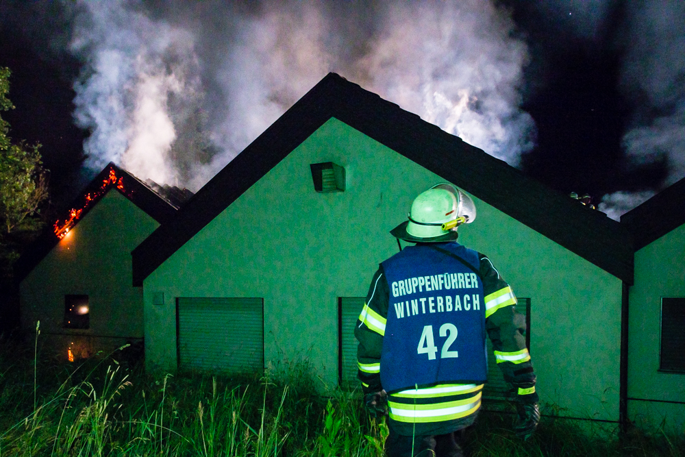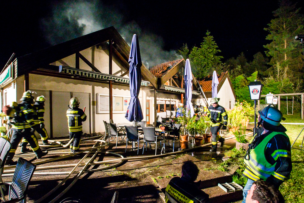 Als neun Minuten später die Winterbacher Feuerwehr unter der Leitung ihres Kommandanten Michael Seim am Rotenbergweg ankam, stand das Clubheim bereits voll in Brand. Mit 44 Mann und sechs Fahrzeugen waren die Einsatzkräfte vor Ort. Gegen 23.30 Uhr war der Brand gelöscht. Die Nachlöscharbeiten der Glutnester zogen sich noch bis 2.30 Uhr hin. Die letzten Feuerwehrleute, die zur Brandwache abgestellt waren, verließen das Gelände aber erst um sieben Uhr morgens.