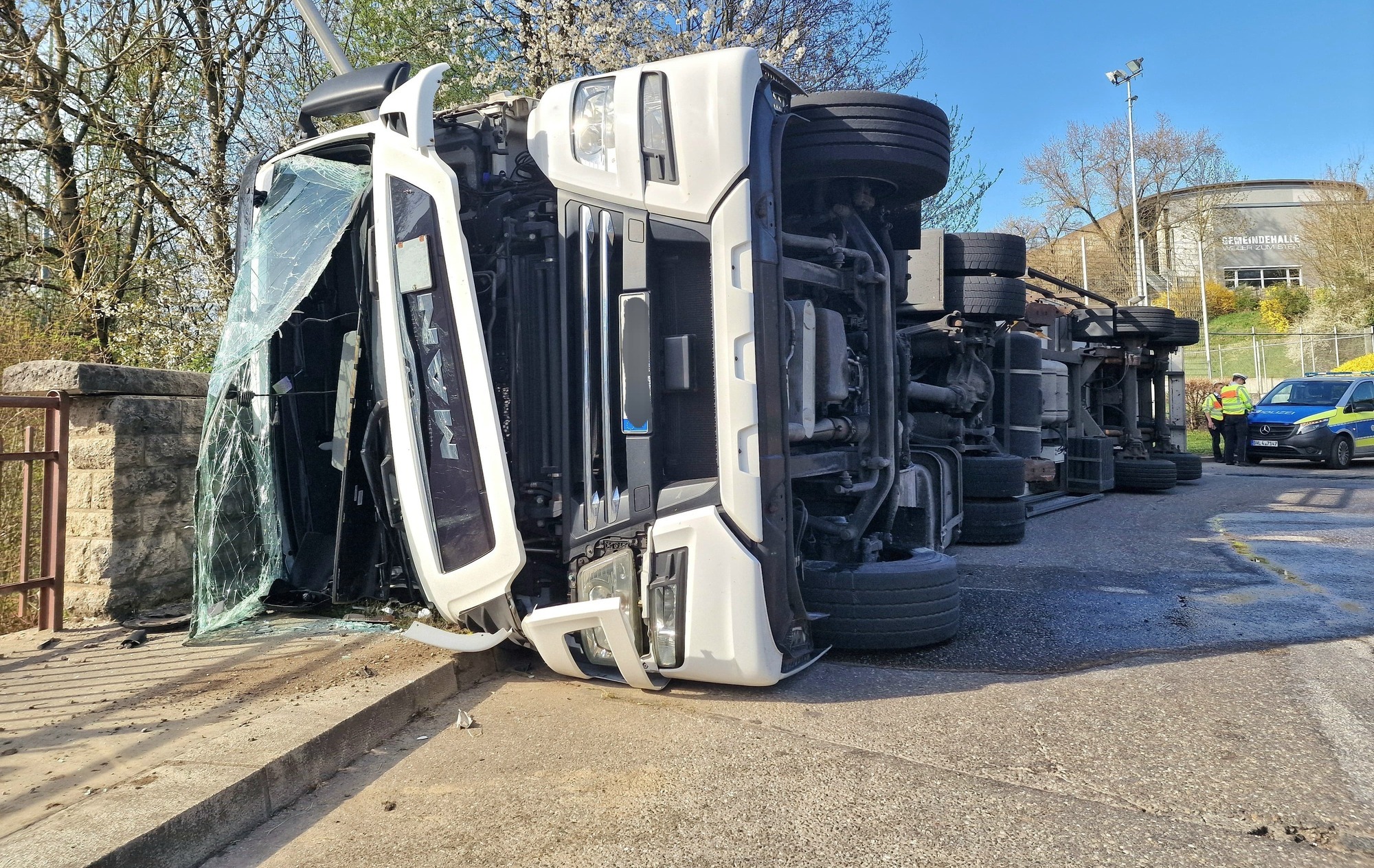 Ein 46-jähriger Lkw-Fahrer befuhr mit seiner Sattelzugmaschine die Straße „In der Steige“, als das Fahrzeug wegen nicht angepasster Geschwindigkeit im Bereich der Kurve auf die rechte Seite kippte. Der Fahrer blieb