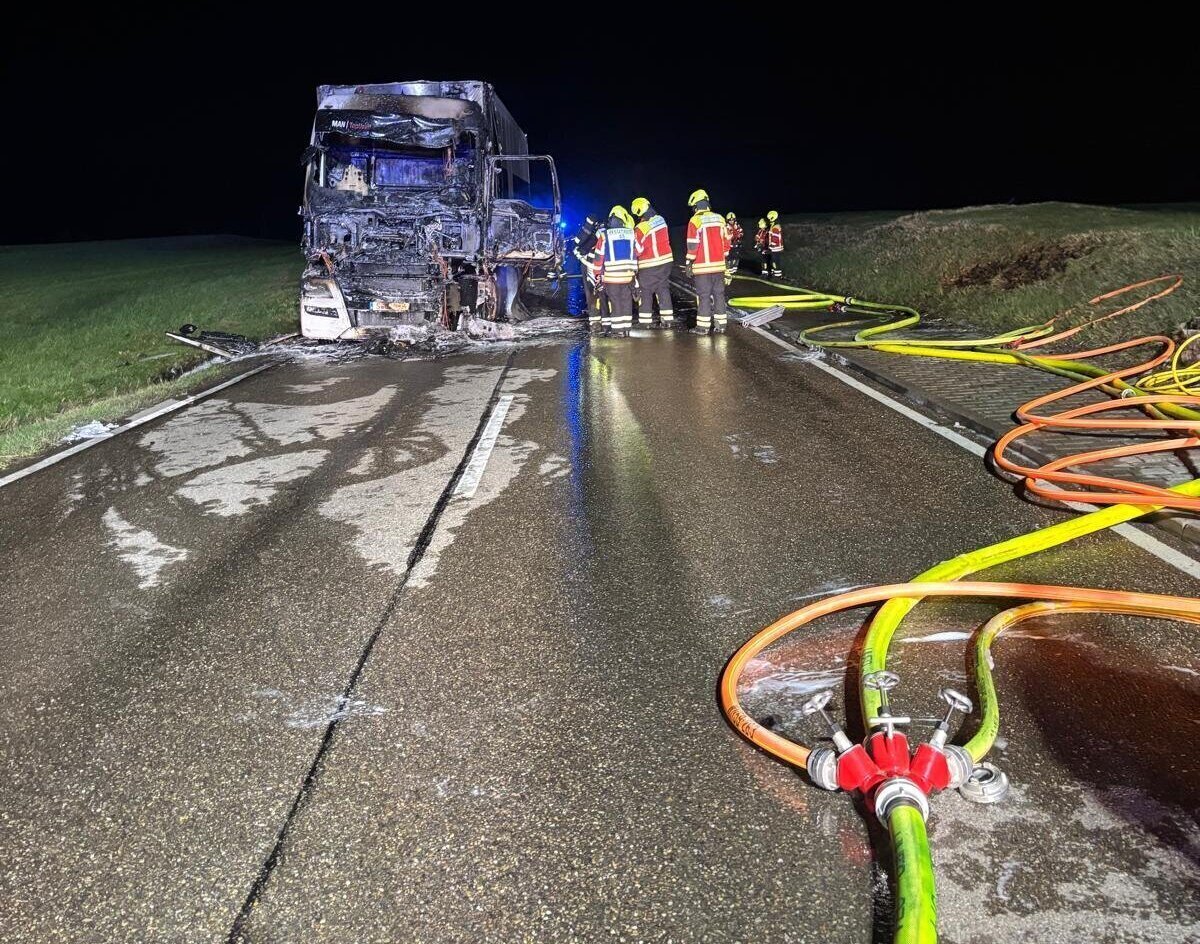 Die Feuerwehr war mit fünf Fahrzeugen und 30 Einsatzkräften vor Ort und löschte den Lkw, welcher abgeschleppt werden musste. Verletzt wurde niemand. Die Straße musste für