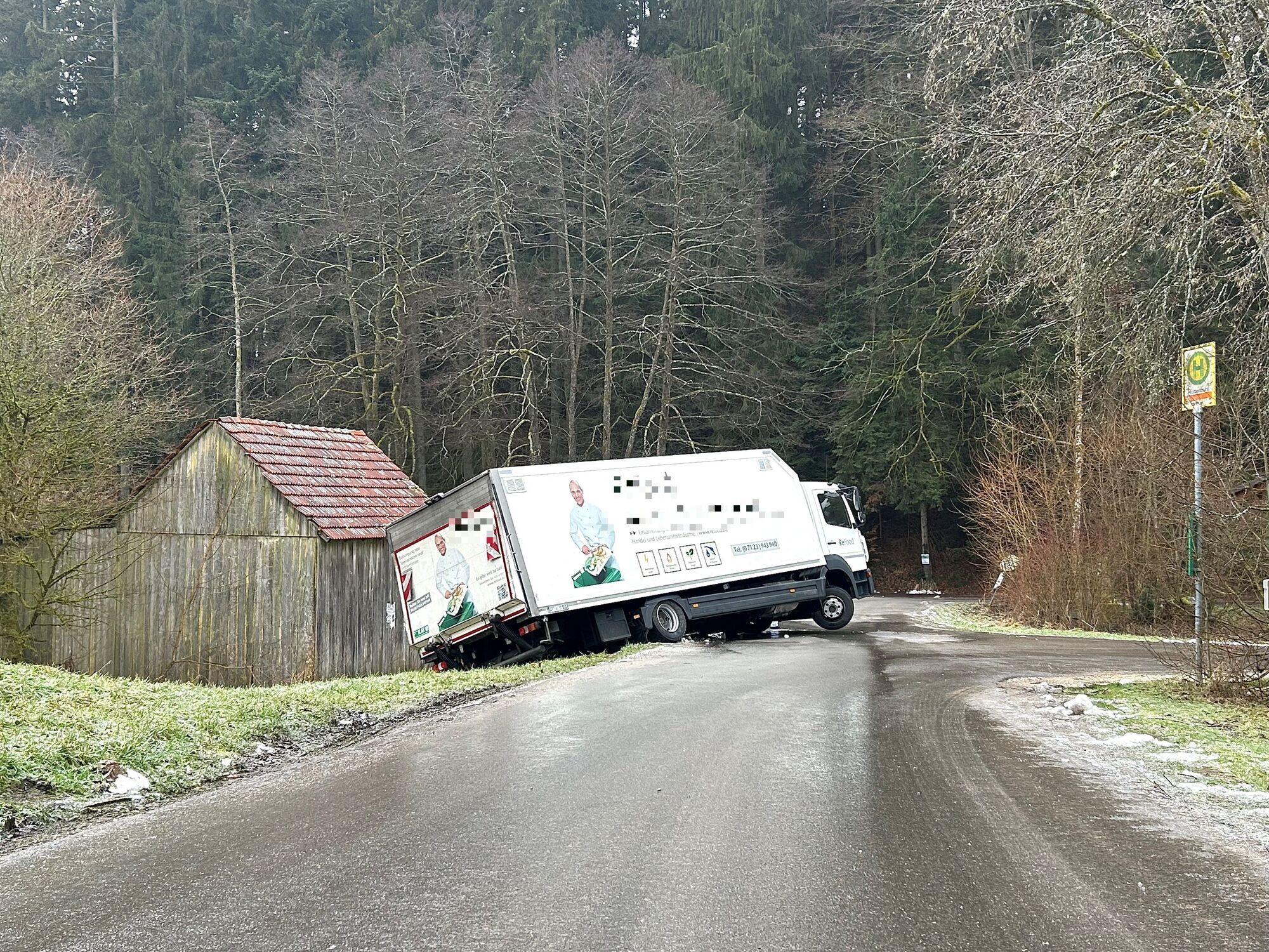 Unser Fotograf Markus Metzger entdeckte am Vormittag einen Laster, der im im Teilort Hüttenbühl nahe Hagerwaldsee in einer Kurve ins Rutschen kam. Dort stand er dann am Vormittag für längere Zeit. Dem Fahrer ist nichts passiert, aber weil es so viele Unfälle gab, kam zunächst keine Hilfe.