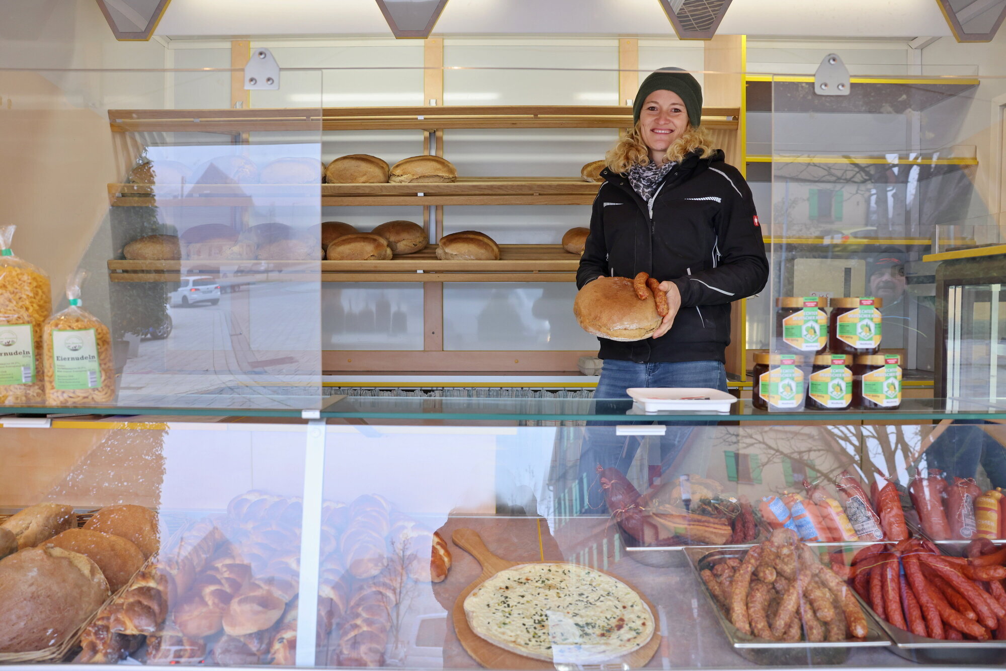 Auch wenn die Zeit vor Ort begrenzt ist. Denn nur von 9 bis 12 Uhr werden hier Waren feilgeboten. Entsprechend groß ist der Andrang, wenn sie mit frisch gebackenem Brot, mit geräucherten Wurstwaren,