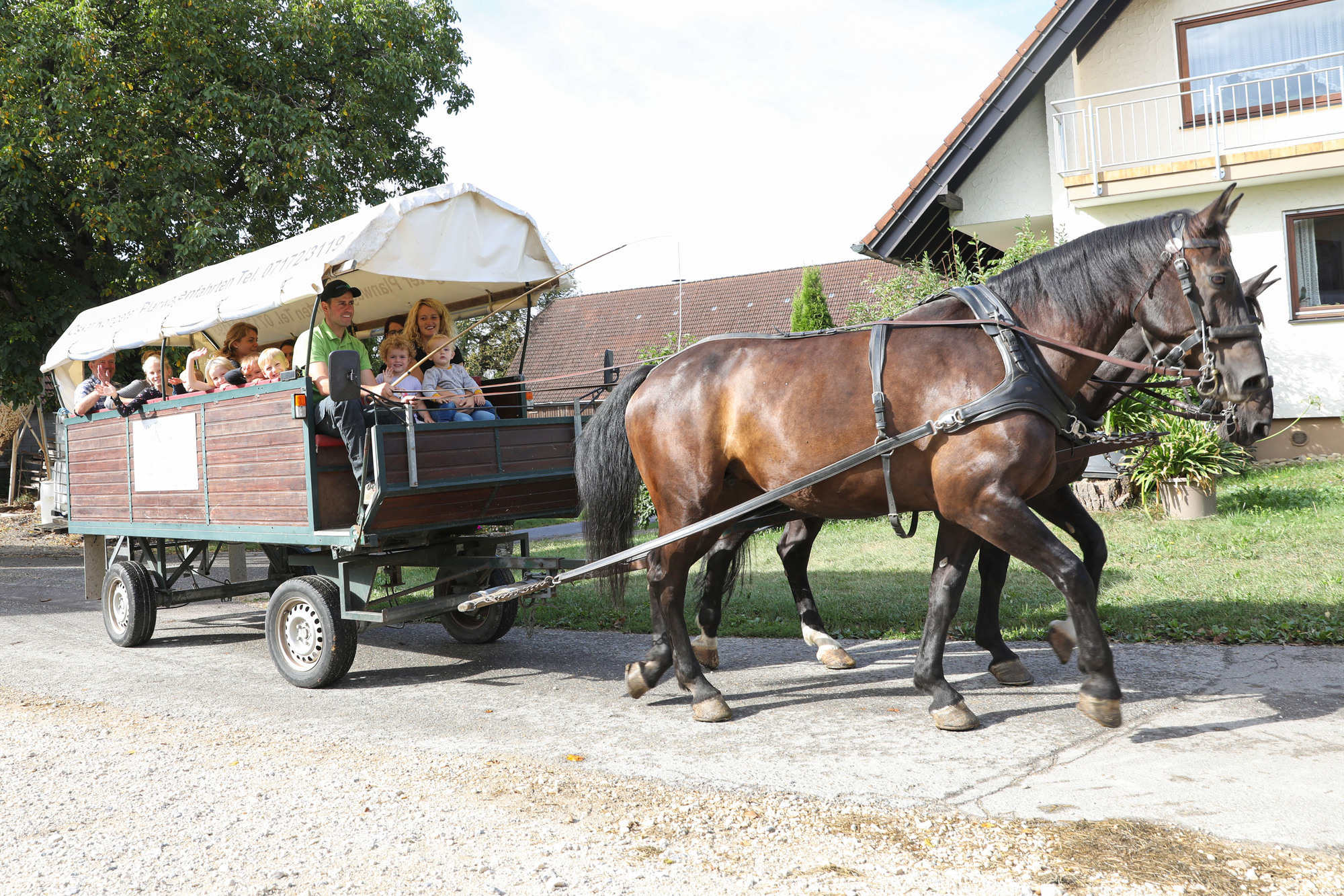 Goldgelbes Stroh liegt im Innenhof des Bauernhofs von Familie Köngeter in Alfdorf-Brech. Schnaubend stehen zwei bildschöne Altwürttemberger Pferde in der Nähe des zuvor liebevoll hergerichteten Planwagens und warten darauf, angesäumt zu werden. „Da die einen guten Charakter haben und sehr nervenstark sind, züchten wir diese Rasse und das bereits in dritter Generation,“ verrät Denisa Köngeter, die mit ihrem Ehemann Marco Köngeter den regionalen landwirtschaftlichen Betrieb, nebst eigenem