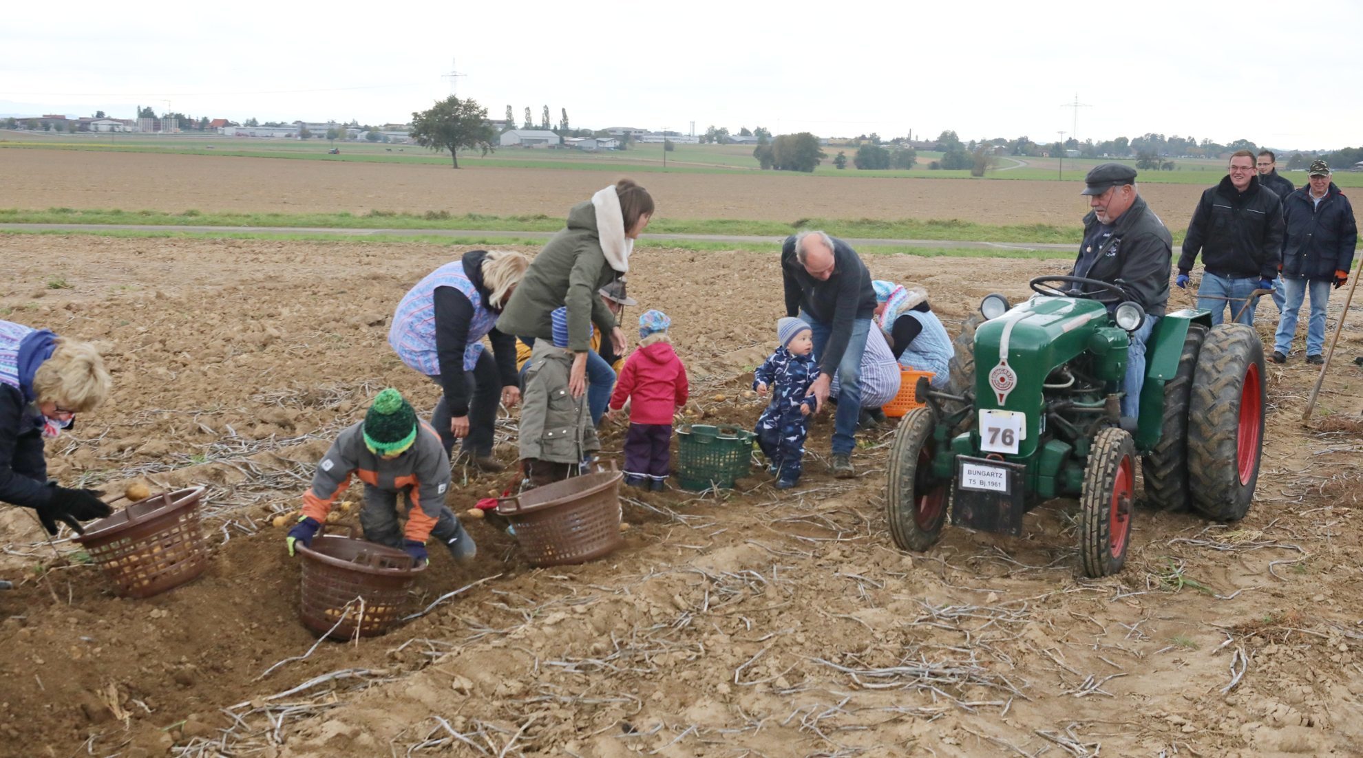 Bis zur Salatschüssel mit dem schön schmatzenden Kartoffelsalat ist es noch ein ganzes Stück Arbeit: Zahlreiche Hände grubeln die Knollen aus der Erde. Viele Kinder graben in dicker Regenkleidung mit - „sie lieben das Dreckeln“, freut sich Waltraud Knappenberger von den Schlepperfreunden über die rege Teilnahme.