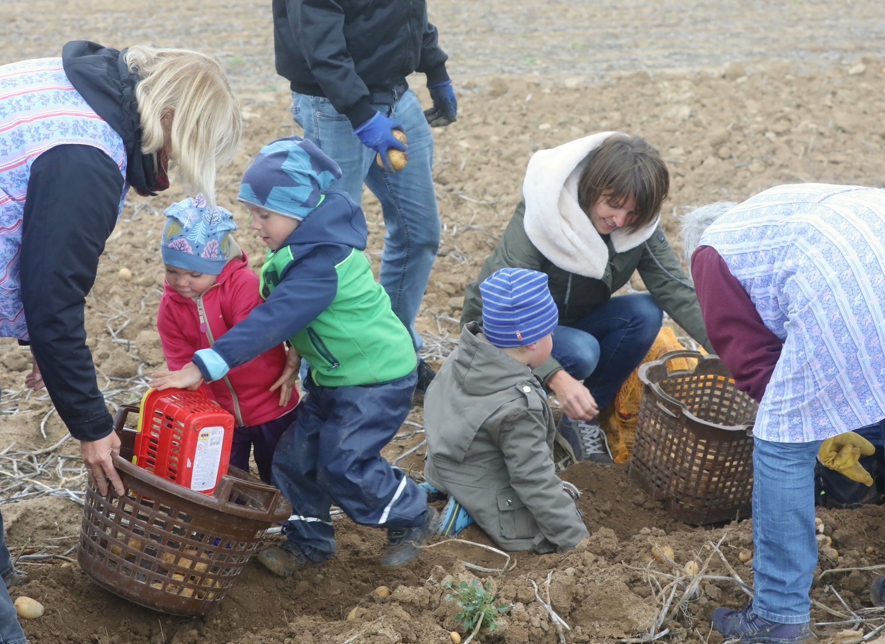 In sicherem Abstand von diesem „Erd-Krümelmonster“ folgen die Erntehelfer, die den Feiertag im Dieseldunstkreis tuckernder Motoren auf dem Kartoffelacker verbringen. Die Frauen stecken in Original-Kittelschürzen: „Damit es echt aussieht, früher hat man zum Schaffen eine getragen“, sagt Regine Weißer stolz und lacht. Die Körbe füllen sich rasch. Roder und Pflug haben gute, erdauflockernde Vorarbeit geleistet. Wie auf dem Silbertablett liegen die reifen Salatkartoffeln der Sorte „Antonia“ da, die wir so gern zu Kartoffelsalat rädeln. Der Boden: Locker und leicht, „ideal für die Kartoffelernte“, sagt mit fachkundigem Blick Landwirt Daniel Linckh, auf dessen Acker in Enderbach die Schlepper kreisen.
