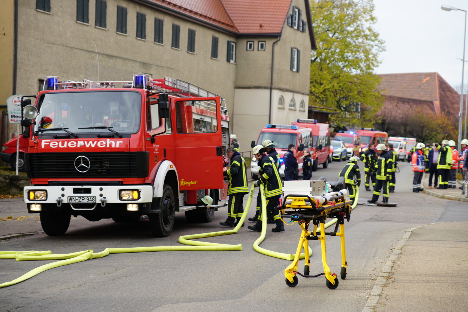 Da das Alarmstichwort Wohnungs- und Gebäudebrand lautete, rückte die Feuerwehr mit Kräften aus Welzheim, Kaisersbach und Alfdorf im Großaufgebot und mit Drehleiter-Fahrzeug an. Auch das DRK mit Kräften des Ortsverbands Alfdorf war mit mehreren Fahrzeugen vor Ort. Die angrenzende Untere Schlossstraße war wegen des geballten Aufgebots für einige Zeit gesperrt.