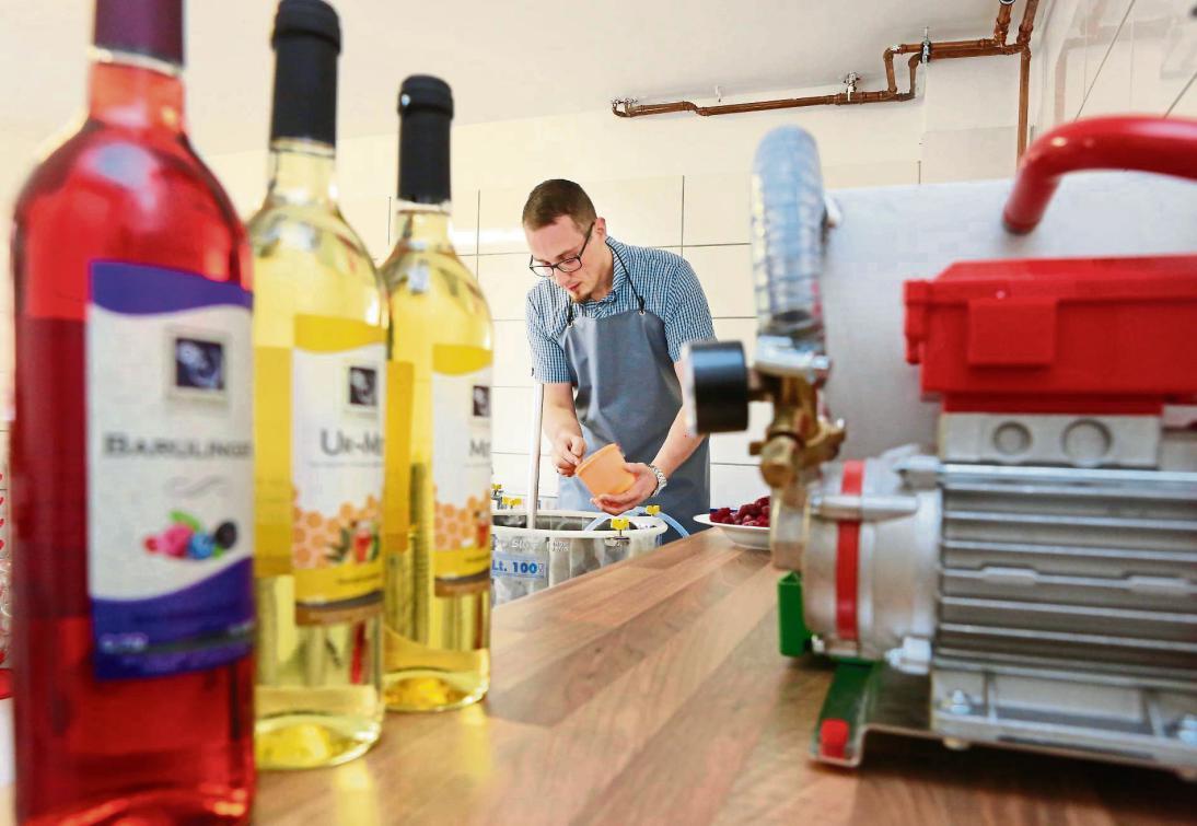 Vor rund 13 Monaten hat er ein Gewerbe angemeldet und seine Produktionsstätte im Haus ausgebaut. „Es ist eine Nische“, sagt er über die Fruchtwein-Kellerei. Er müsste schon viel Überzeugungsarbeit leisten, denn „jeder rümpfe bei Met und Fruchtweinen die Nase“. Er habe als Weingenießer und Autodidakt einen Met genau nach seinem Geschmack hergestellt. „Ich liebe gute Weine. Ich will einen Wein, der dem typischen Viertelesschlotzer schmeckt!“ Er weiß, dass regionale Sachen im Kommen sind. Auch darum hat er sich einen eigenen Online-Shop gebaut. „Ich verlasse klassische Pfade“, hält er fest, obwohl er mit dem Himbeer-Wein „Junge Charlotte“ einen klassischen Damen-Wein im Angebot habe. Seine Frucht-Weine verkauft er an Dorfläden und will nun vermehrt auf Märkten aktiv werden.