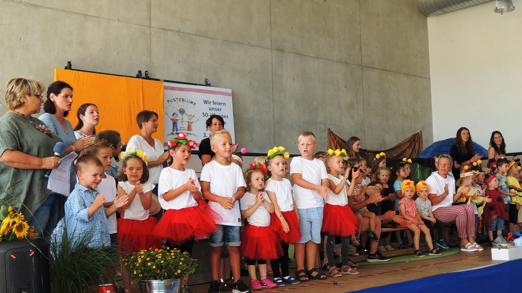 Beim Betreten des Bürgerzentrums ging dem Besucher am Sonntag das Herz auf. Voller Anspannung sausten da eine Vielzahl an bunten Blumen, Hühner, Gärtner und auch Marienkäfer durch die voll besetzten Stuhlreihen. Konnten es kaum erwarten, bis endlich die Bühne erobert werden konnte. „Alle 85 Kinder machen mit", verrieten die beiden Kindergartenleiterinnen Andrea Hudelmaier und Sina Rommel. Daher war der Nachwuchs kostümiert und aufgeregt. Denn einer der Höhepunkte anlässlich der 50-Jahr-Feier