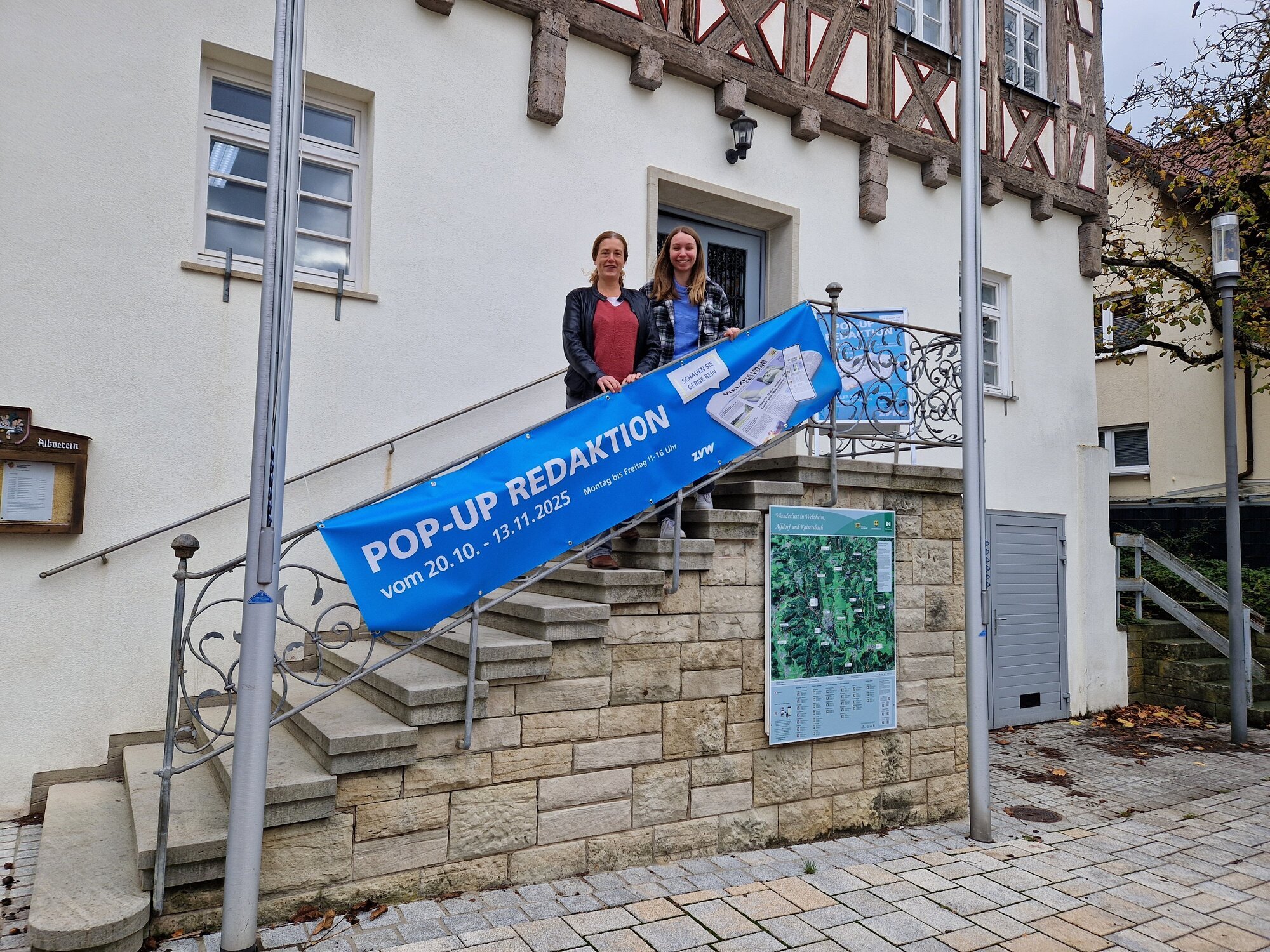 Alfdorf. Pünktlich zur Eröffnung der Pop-up-Redaktion verlangsamt sich das Leben im Ortskern von Alfdorf. Nein, Tempo 30 wurde nicht eingeführt, damit die Vorbeifahrenden das Banner des Zeitungsverlags Waiblingen an der Treppe des Alten Rathauses besser wahrnehmen können. Aber es passt gut zum ruhigen Umfeld. Wobei: So ruhig ist es dann doch nicht - Neugierige und auch Zeitungsleser, die ein konkretes Anliegen haben, freuen sich über die Gelegenheit, mal direkt vor Ort reinschauen zu können.