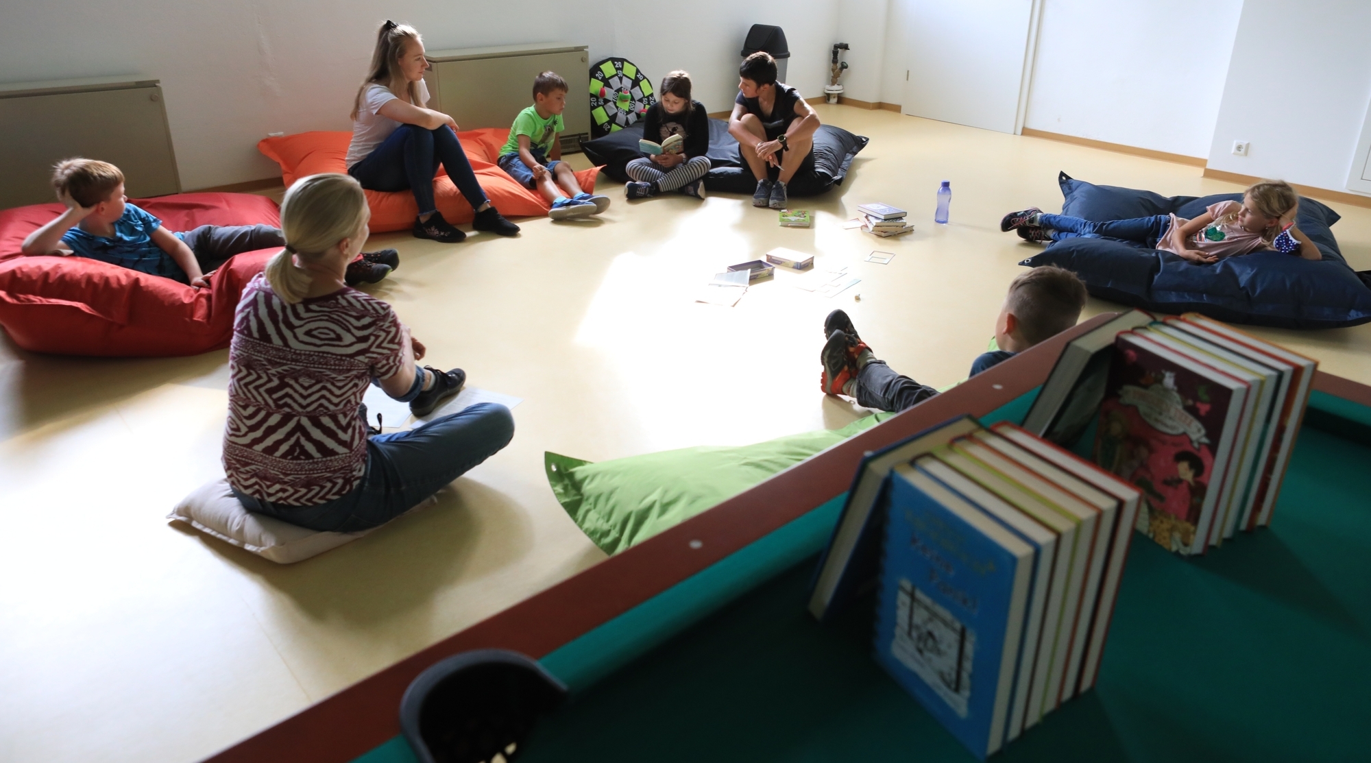Im (neu hergerichteten) Bewegungsraum im Untergeschoss liegen Kinder weich gebettet auf großen Sitzsäcken, fast schon zu bequem, gemütlich, um konzentriert vorzulesen und vor allem aufmerksam zuzuhören. Die reinste Komfortzone