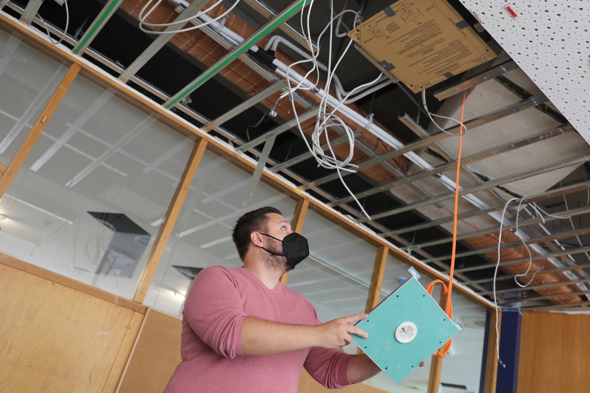 Draußen, direkt neben den Hochbeeten, auf der Rückseite der Nachbarschaftsschule, stehen, noch auf Paletten und verpackt, schrankhohe Klimageräte. Sie bleiben auch draußen, es sind nämlich laut Aufschrift „Outdoor Units“. Man kann noch mehr ablesen: Dass Mitsubishi der Hersteller ist, die Japaner können also nicht nur Auto und auch sie lassen offensichtlich längst im günstigeren Ausland produzieren: „Made in Thailand“ steht da nämlich, samt dortigen Schriftzeichen. Bauamtsleiter Reiner