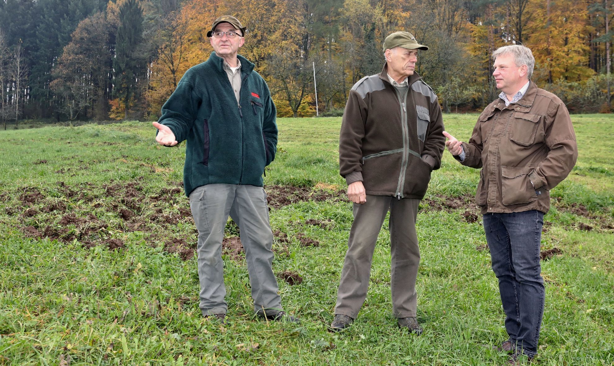 Ihnen bleibt die Hoffnung auf einen harten Winter. Denn wenn alle Frischlinge durchkämen, sei die „Katastrophe“ vorprogrammiert. Damit meinen sie die Folgen, wenn sich so eine Rotte über eine Grünfläche hermacht. Die Abstände der „Überfälle“ werden immer kürzer. Riker zeigt dazu einen „umgepflügten“ Hang bei Hößlinswart, nahe dem Gehölzlehrgarten. Dreimal hat er den in diesem Herbst bereits mit seinem eigenen Wiesenhobel wieder eben gezogen. Vergeblich, vergangene Nacht waren die ungebetenen Besucher wieder da. Er resigniert: „Jetzt lasse ich es so liegen, es bringt ja eh nix.“ Das Ergebnis der Wühlarbeit: Der Pächter, ein Landwirt, kann das Gras an den betreffenden Stellen nicht abmähen, sonst kämen die Erdbollen mit ins Futter. Das Stückle wird so unnütz.