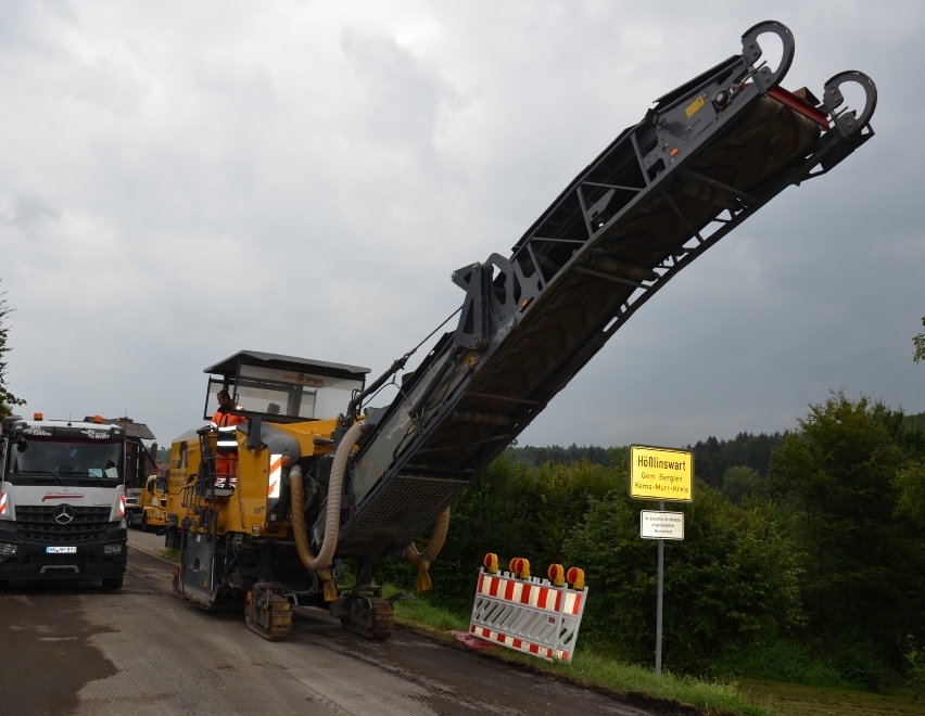 Die Baustelle erstreckt sich nun von dort bis etwa zur Ortsmitte Hößlinswart. Die Sanierung besteht aus der Erneuerung der Fahrbahndecke, der Verschleißschicht, im Bestand, es gibt also keinen Ausbau. Zunächst wird die Deckschicht abgefräst und dann geschaut, in welchem Zustand der Unterbau ist. Der wird repariert, wenn sich erkennbar Risse gebildet haben. Das geschieht dann punktuell, an den betreffenden Stellen.