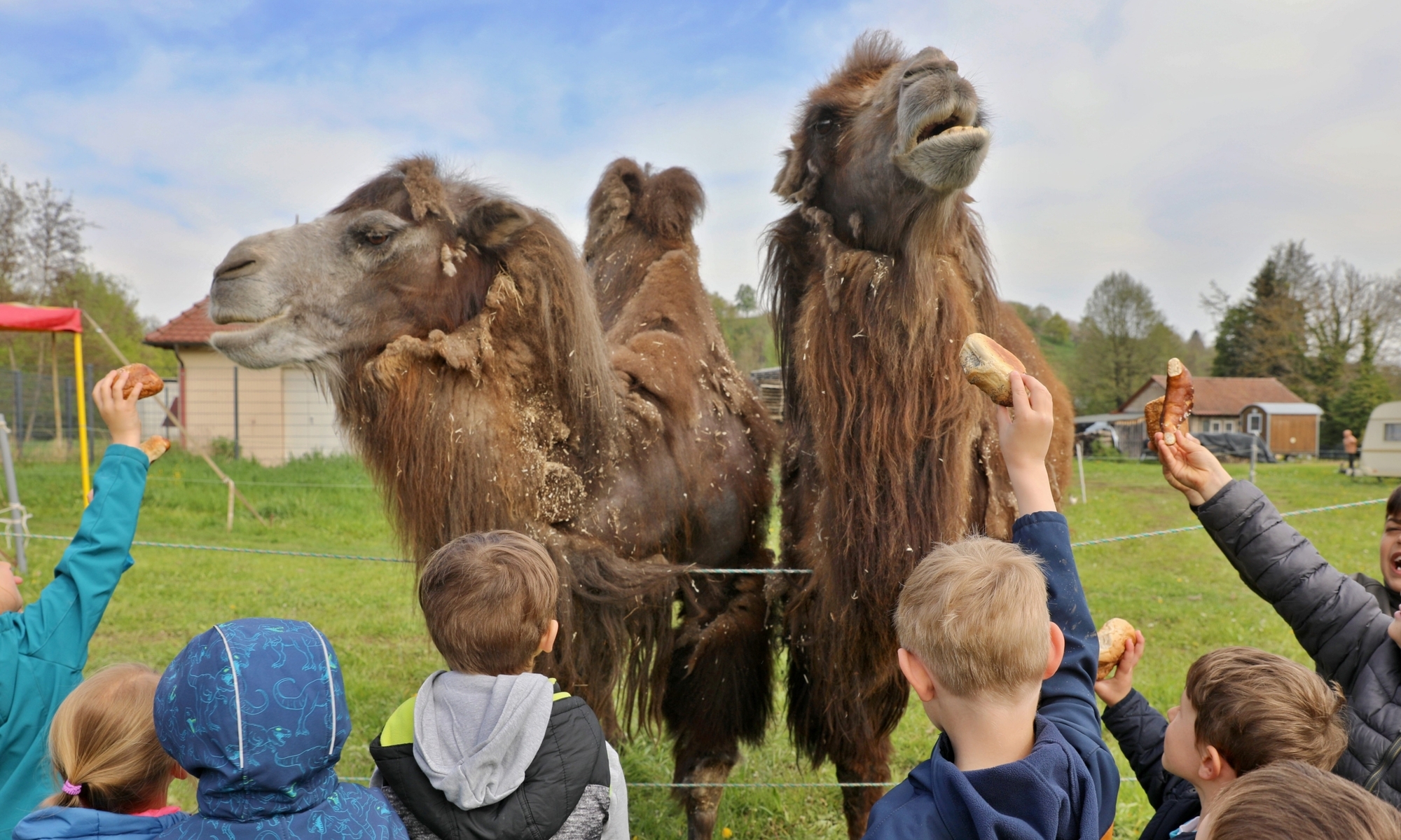 Friedlich dösen Kara und Leila vor sich hin. Doch als Giuliano Frank ihre Namen ruft, sind sie sofort hellwach und trotten zu ihm hin. Kamele sind auch nicht blöd. Es ist zwar schon halb elf, aber für einen Frühstücksbrunch ist es eigentlich nie zu spät. Zumal die exotischen Vierbeiner eine Überraschung erwartet, denn serviert wird ihnen ausnahmsweise nicht vom Chef des Zirkus Bravissimo, sondern vom Nachwuchs des Kinderhauses Steinach.