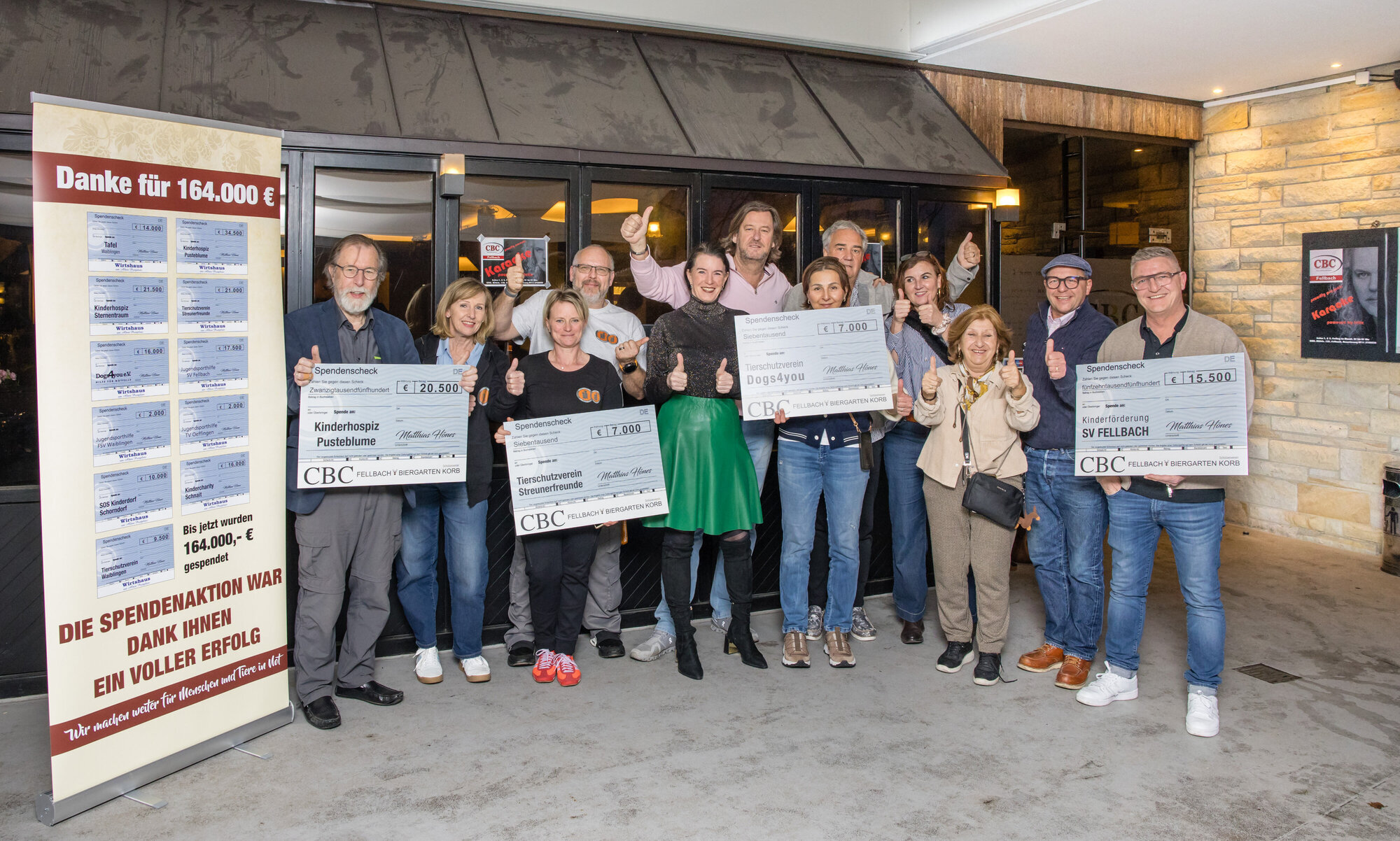 Fellbach. Im „CBC“ in Fellbach und im „Wirtshaus“ am Postplatz in Waiblingen verbindet der Inhaber seit einiger Zeit Günstigpreise fürs Essen mit Spenden für gemeinnützige Organisationen. Die Restaurant-Gäste entscheiden selbst, ob, für wen und wie viel sie spenden. Aus der letzten Runde hat Matthias Hönes nun symbolische Schecks in Gesamthöhe von 50.000 Euro überreicht: Das Kinderhospiz Pusteblume erhält 20.500 Euro; der SV Fellbach bekommt 15.500 Euro für den Bereich