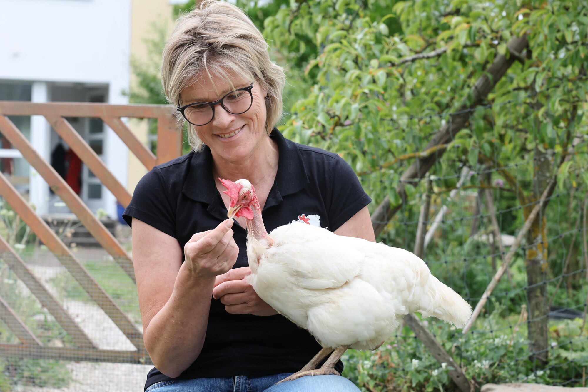 Fellbach/Stuttgart. Kaum öffnet Simone Metzger die Tür zum Gehege, folgen ihr sechs Hühner auf dem Fuße. Mit wildem Gegacker und Geplapper versammelt sich die kleine Gruppe um Metzger, die unter der Gartenlaube Platz nimmt. Mittendrin ist Holly. Das Nackthalshuhn wurde als Küken in einem Weinberg in Fellbach entdeckt. Und dass sie jetzt hier bei Simone Metzger gelandet ist, war ein Glücksfall. Für Tier und Mensch. Wir treffen die Tierschützerin zu einem Gespräch in