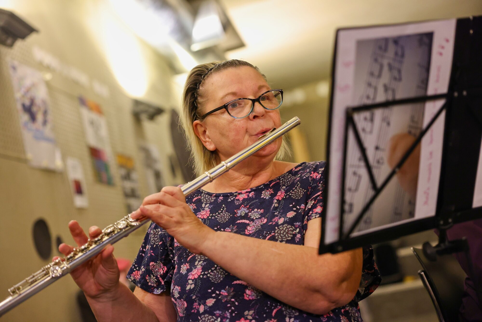 „Und weil wir uns so freuen, fangen wir an zu tanzen“, sagt Musiklehrerin Claudia Bühlweiler in die Runde. Das Warm-up ist für die Gruppe wichtig, erklärt Bühlweiler im Gespräch mit unserer Redaktion. Denn viele der anwesenden Musiker können