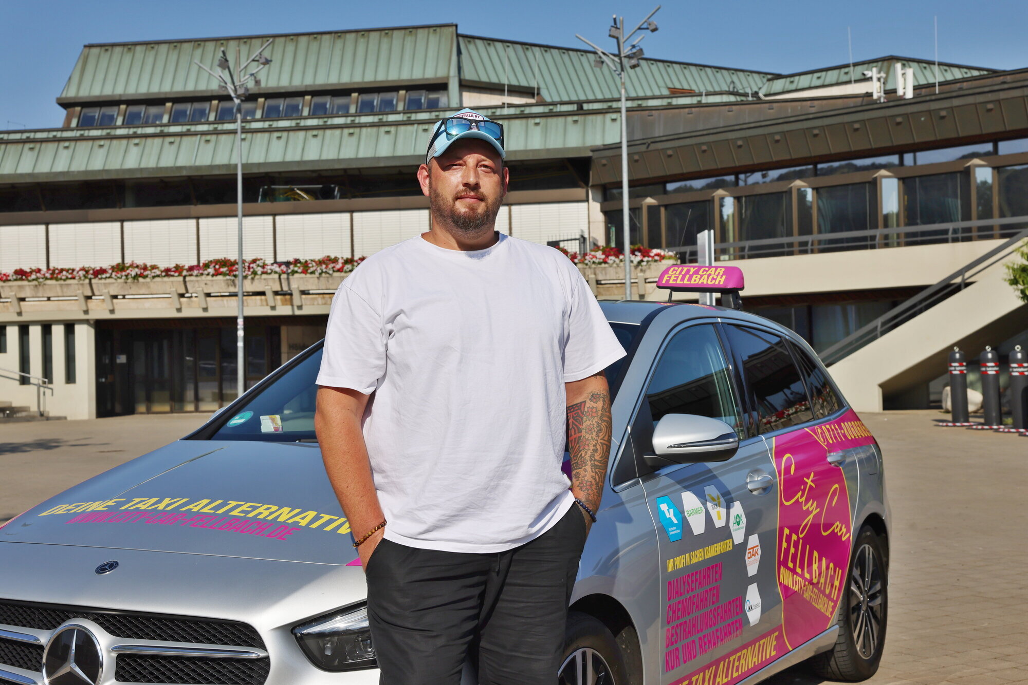Fellbach. Wenn Kranke zur Dialyse oder Chemo fahren müssen, sitzt oft Marcus Diler am Steuer. Er hat viele Stammkunden, die er regelmäßig fährt. Der 41-Jährige ist Fahrdienstleister aus Fellbach und liebt seinen Beruf. Schon vor 50 Jahren hatten seine Eltern einen Taxibetrieb, mit dem er aufwuchs. „Es ist einfach eine Herzensangelegenheit“, sagt der 41-Jährige im Gespräch. Wir treffen ihn an der Fellbacher Schwabenlandhalle, einem Ort, an dem oft Menschen an- und
