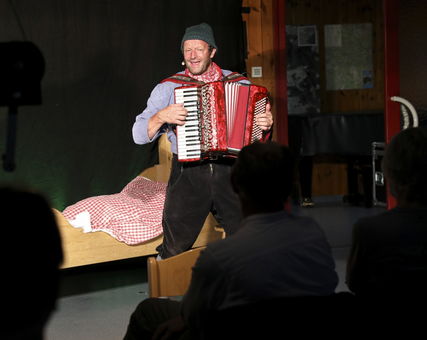 Der „Wilderer“ Fidelius Waldvogel alias Martin Wangler stürmte effektvoll durch den Hintereingang in den Raum. Es galt, sich wieder einmal vor den Ordnungshütern in Sicherheit zu bringen. Noch deutlich außer Atem, das erlegte Wild schnell versteckt, überkam ihn nur kurz die Panik vor möglicher Strafe: einfach zu jagen, das sei Freiheit. Auch wenn ihn des Nachts noch die Gedanken an Förster, Waldbauern und sämtliche zuständigen Ämter verfolgten. Der Waldvogel bleibt ein überzeugter Fidelius