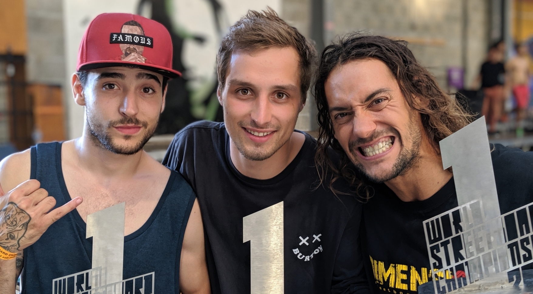 Weltmeister unter sich: Mario Kurrle aus Stetten (Mitte) mit den Erstplatzierten weiterer Streetboard-Disziplinen (links David La Rotta, rechts Sergi Nicolas) bei der WM in Nantes.