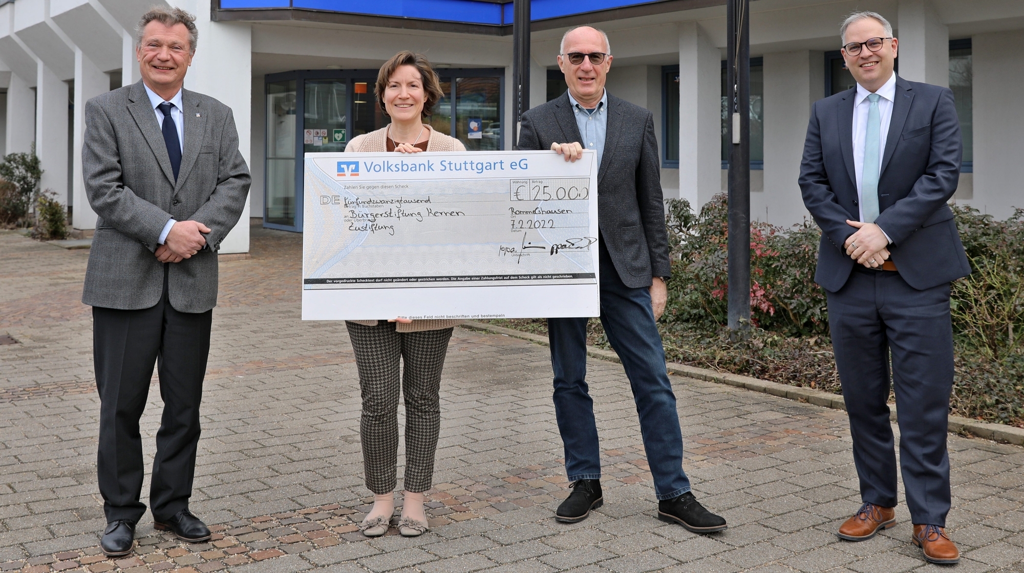 Um das bürgerschaftliche Engagement in Kernen zu unterstützen, hat die Volksbank (Voba) Stuttgart der Bürgerstiftung Kernen in der Volksbank-Filiale in Rommelshausen offiziell einen Scheck in Höhe von 25.000 Euro überreicht. Die Zustiftung erhielt die Bürgerstiftung bereits im Dezember vergangenen Jahres.