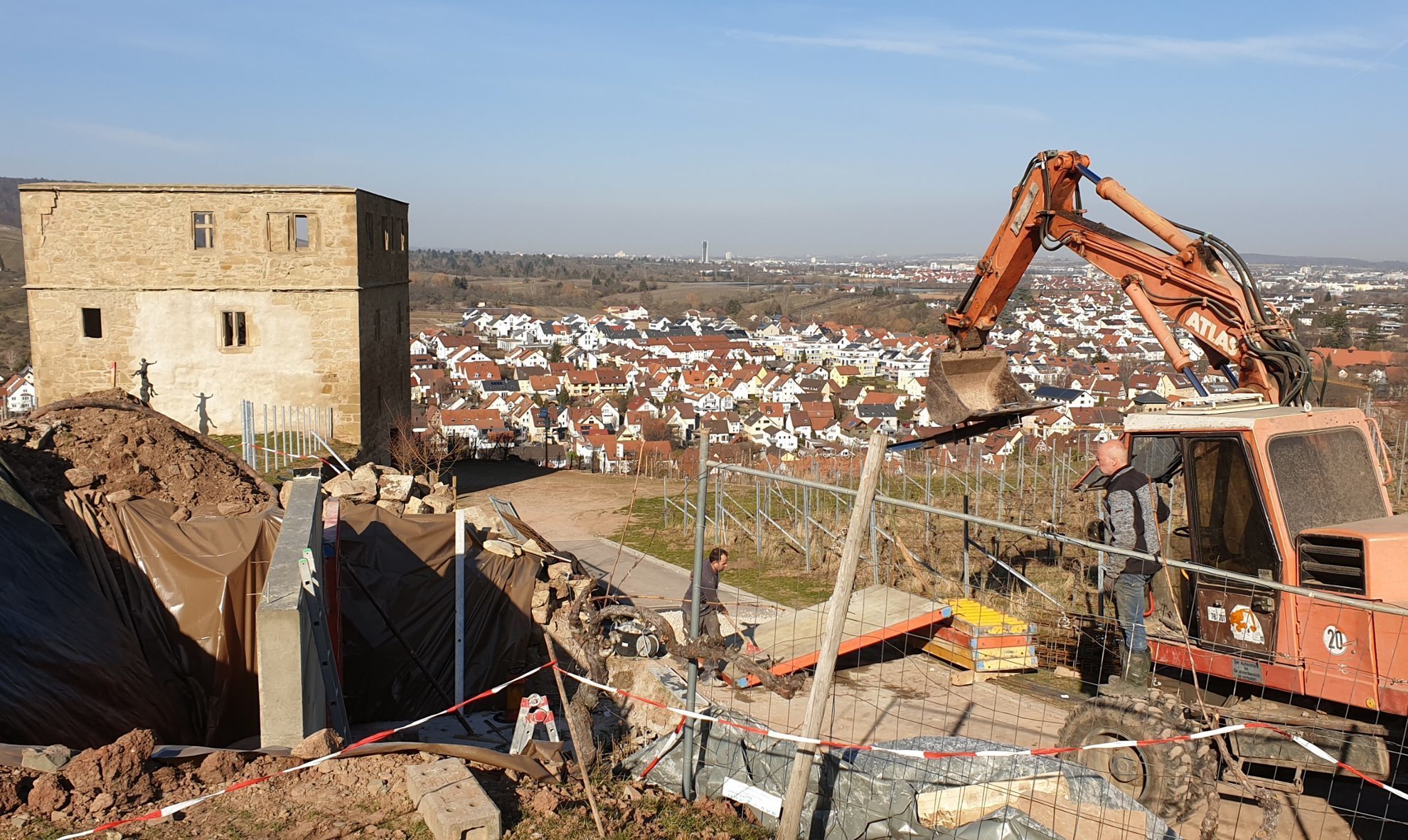 Wer das Frühlingswetter für einen Spaziergang in den Weinbergen nutzt und den Blick von der Yburg ins Tal schweifen lässt, kann sich derzeit einen Spaß daraus machen, Baukräne zu zählen. Sieben Stück ragen allein zwischen den Dächern in Stetten hervor. Doch nicht nur im Dorf wird gebaut, auch oben beim Stettener Wahrzeichen tut sich was. Sybabo, die Baufirma von CDU-Gemeinderat Volker Borck, ist einmal mehr in der Vorbereitung auf die Remstal-Gartenschau im Einsatz.