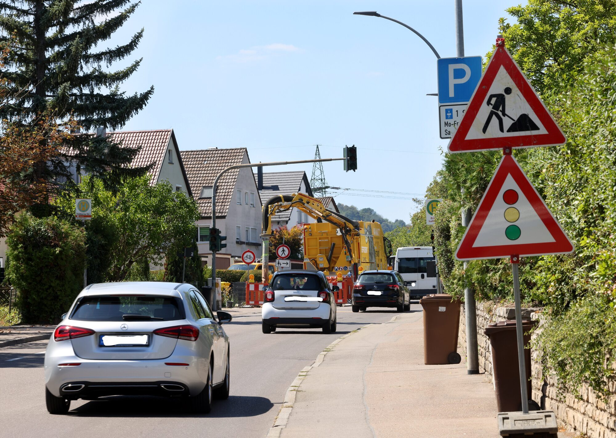 Wer von Fellbach kommend nach Rommelshausen einfährt, der wird in der Fellbacher Straße von einer kleinen Baustelle überrascht. Weil die Baustellenfahrzeuge die Fahrbahn in Richtung Rommelshausen blockieren, regelt eine Baustellenampel den fließenden Verkehr.