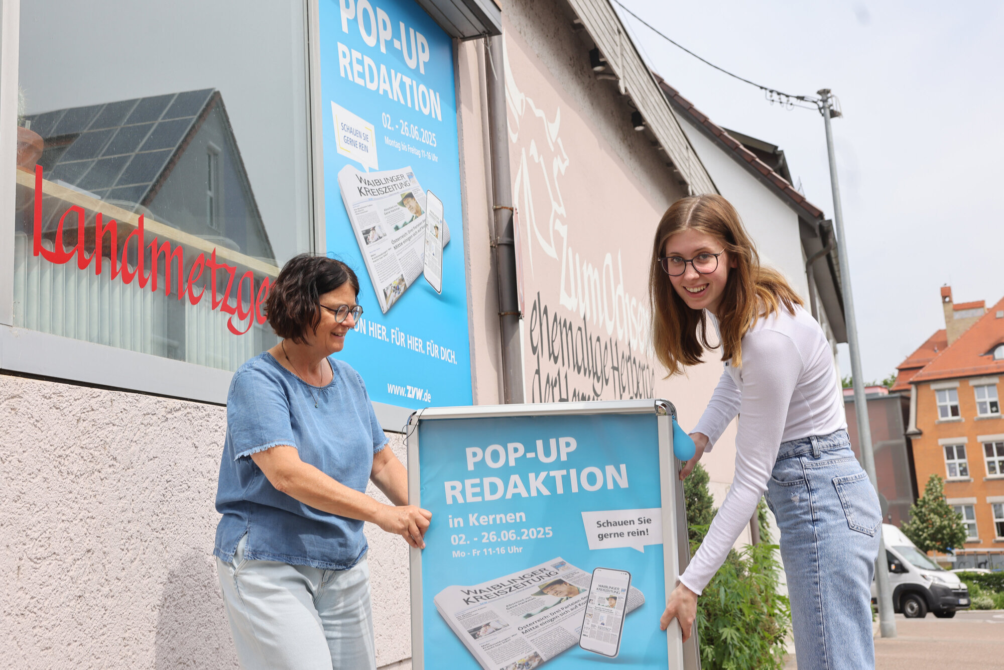 Kernen-Stetten. Montagmorgen, 2. Juni, kurz vor 10 Uhr. Eine Stunde noch, bis die neue Pop-up-Redaktion im Verkaufsraum der Landmetzgerei „zum Ochsen“ für den Publikumsverkehr öffnen soll. Knapp vier Wochen lang, nämlich bis einschließlich Donnerstag, 26. Juni, werden zwei Mitarbeitende der Waiblinger Redaktion und ein Team-Mitglied des Marketings immer von 11 bis 16 Uhr vor Ort und für alle ansprechbar sein, die Fragen oder ein Anliegen rund um Kernen, unsere Zeitung oder