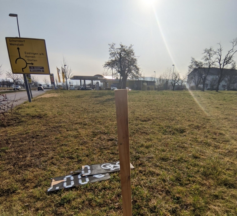 Das „Fahrrad-Schild“ auf der Grünfläche vor der Agip-Tankstelle in Rommelshausen wurde von Unbekannten zerstört. „Da wurde wohl jemand durch das Schild sehr wütend“, schreibt ein Leser am Sonntagmittag unserer Redaktion und hängt das Foto an.
