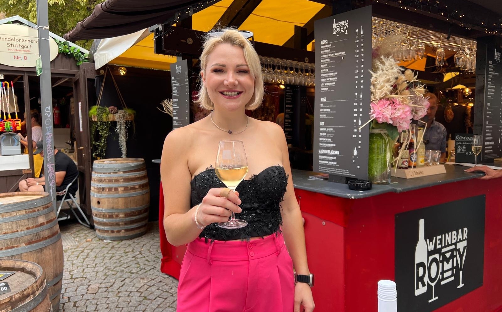 Malerisch eingebettet zwischen Fachwerk und Landesmuseum steht Romy Putlers Weinbar am Schillerplatz in Stuttgart. Zwei Musiker sorgen an diesem Nachmittag für schwungvolle Musik, zu der der ein oder andere Gast fröhlich mit dem Fuß wippt. Gemeinsam mit Adrian Beurer (25) ist die 28-Jährige als Kernener Vertretung auf dem Weindorf zu finden – Romys Weinbar kennt man aber auch als Foodtruck-Version vom Standort vor dem Sängerheim. Auch Adrian Beurer vom Weingut Beurer führt auf dem Weindorf