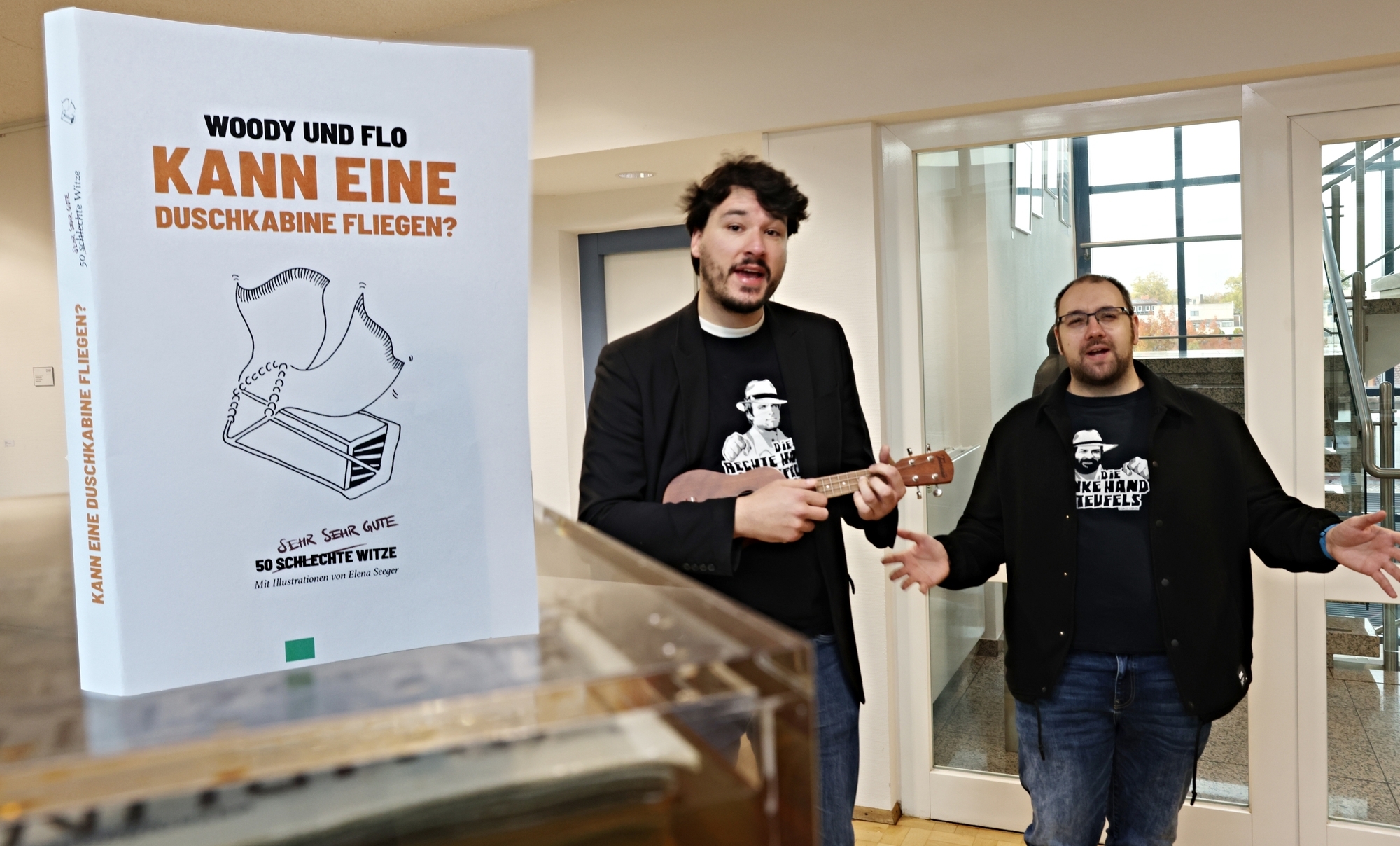 Liebhaber von Wortwitzen aufgepasst! Warum gibt es Kontaktlinsen, aber keine Kontaktspätzle? Darf eine Uhr im Halteverbot eigentlich stehen bleiben? Oder kann eine Duschkabine fliegen? Auf diese und weitere Fragen geht das musikalische Komiker-Duo „Woody und Flo“ (WuF) während seines Auftritts am Montag, 28. November, ein. Florian (Flo) Ladenburger auf der Ukulele und Benjamin (Woody) Holzinger als Sänger treten erstmals im Theaterhaus in Stuttgart auf. „Eine große Ehre“, dort aufzutreten,