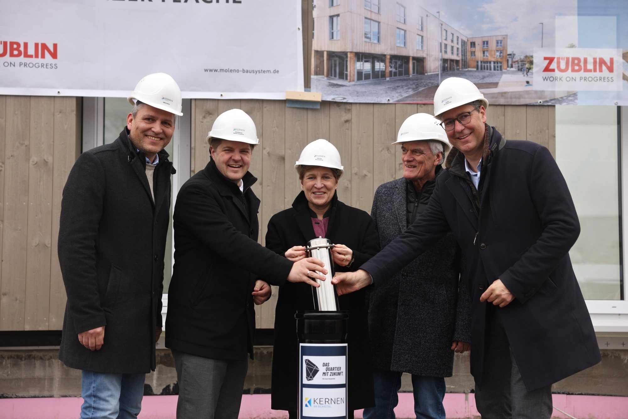 Kernen. Wie einen Grundstein legen, wenn die Häuser Wand für Wand mit dem Kran einschweben, die Badezimmer als fertige Module in die Wohnungen gesetzt werden und gar nichts mehr gemauert wird? Die Gemeinde Kernen hat sich hierfür eine alternative Lösung einfallen lassen: Am Donnerstag, 20. Februar 2025, wurde gemeinsam mit Wohnministerin Nicole Razavi und IBA'27-Intendant Andreas Hofer eine Zeitkapsel im Boden versenkt - darin enthalten: zwei aktuelle Ausgaben der lokalen