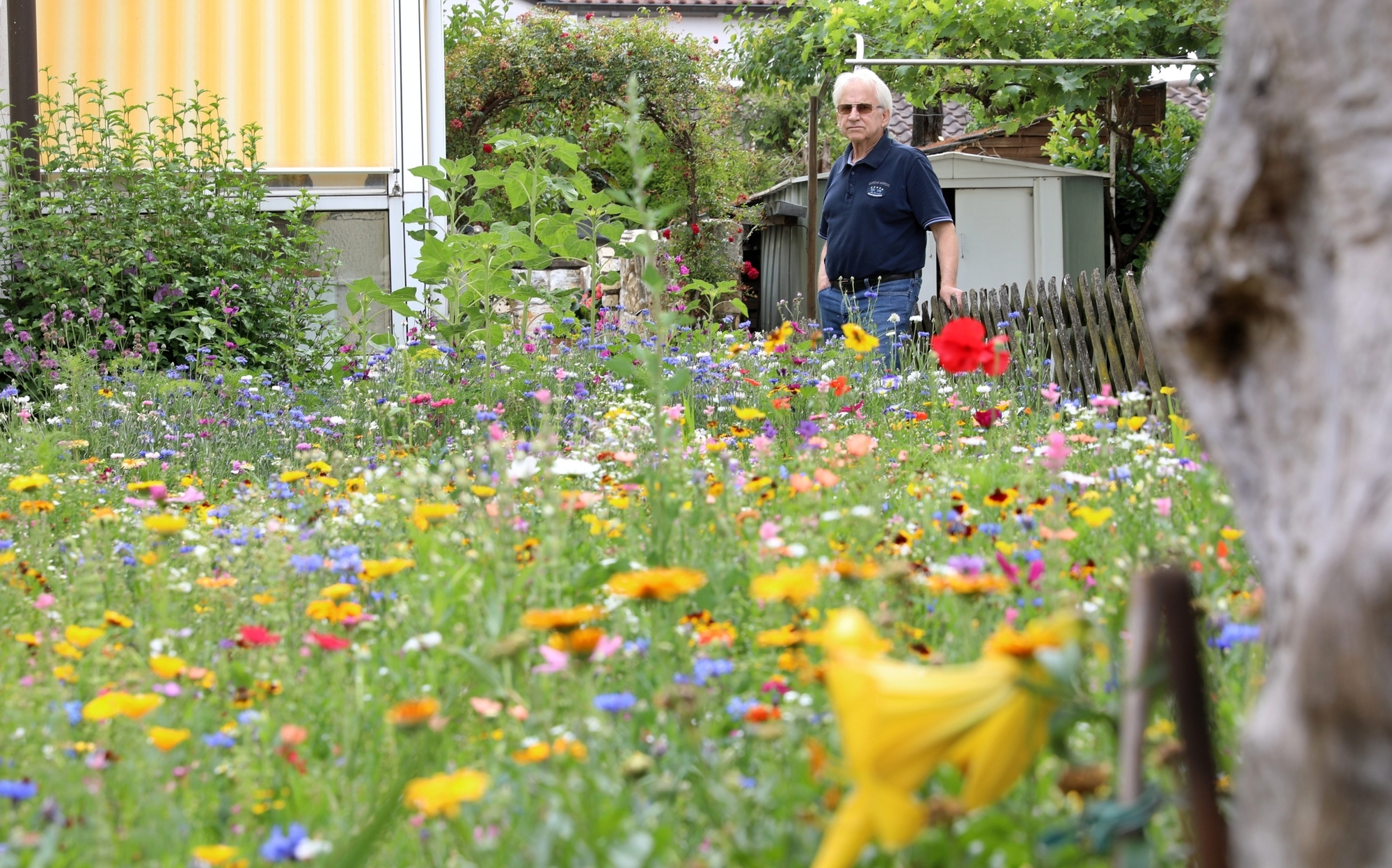 Horst Heim steht zufrieden neben der kleinen bunten Wiese in seinem Garten in der Friedrich-Silcher-Straße in Kernen-Rommelshausen. Gelb, rot, blau, lila, rosa - in unzähligen Farben schillern die Wildblumen auf der rund 24 Quadratmeter großen Fläche. Bei genauerem Hinsehen entpuppt sich das kleine Feld als großes Wimmelbild: Hunderte kleiner Wildbienen, Honigbienen und Hummeln flitzen von Blüte zu Blüte, ihr Summen erfüllt die Luft. „Die Wildbienen beobachte ich abends immer“, berichtet