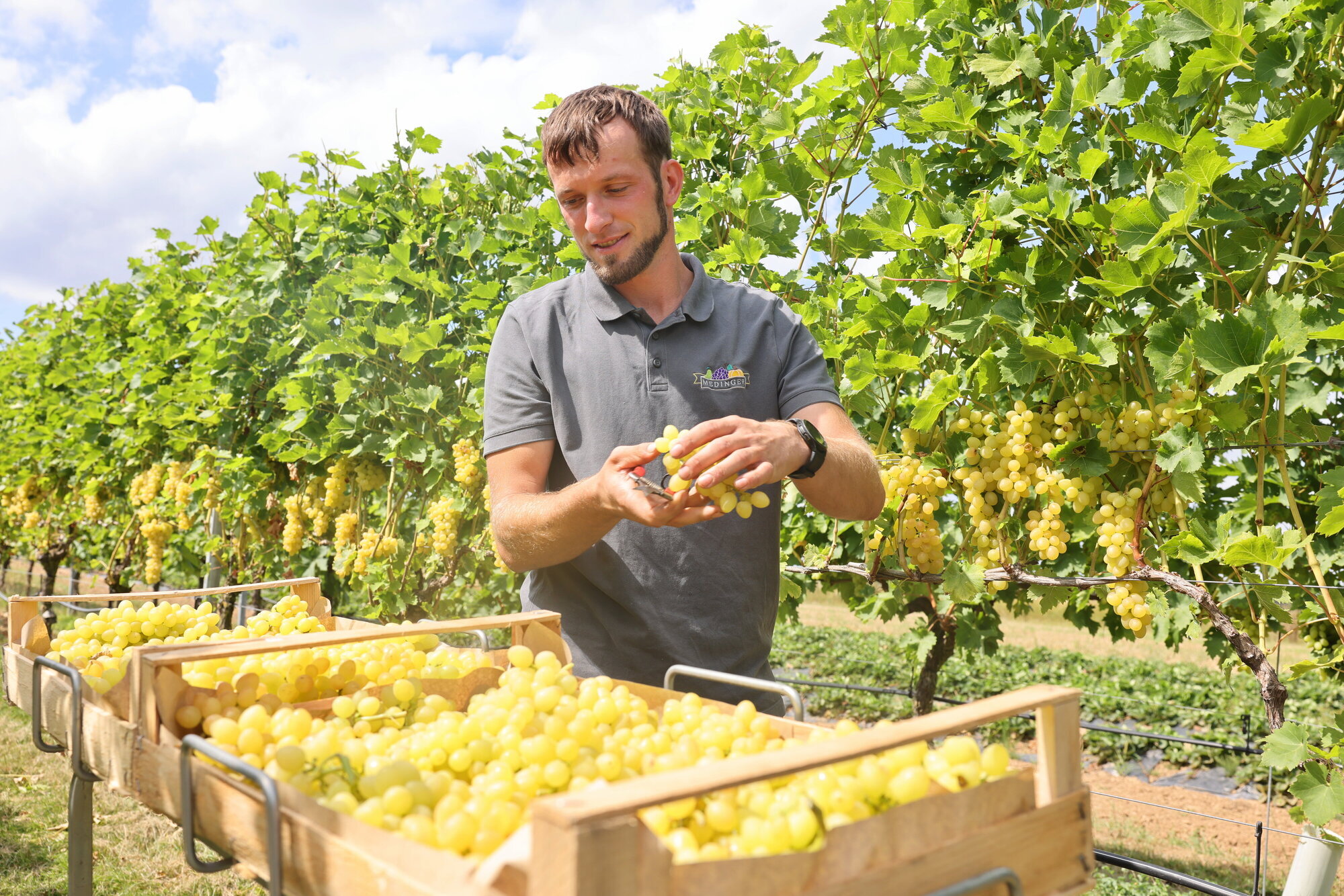 Kernen-Stetten. Christian Medinger steht zwischen den Reihen einer Traubenplantage und legt vorsichtig Trauben für Trauben auf einen Wagen, der mit Obstkisten beladen ist - dabei ist es gerade erst Ende August, ein bisschen früh für die klassische Weinlese. Aber der 32-Jährige Obstbauer und CDU-Gemeinderat erntet hier, zwischen dem Ortseingang von Stetten und dem Weingut Konzmann, nicht für die Weinproduktion - diese helle kernlose Sorte ist für den Verzehr gedacht, auf