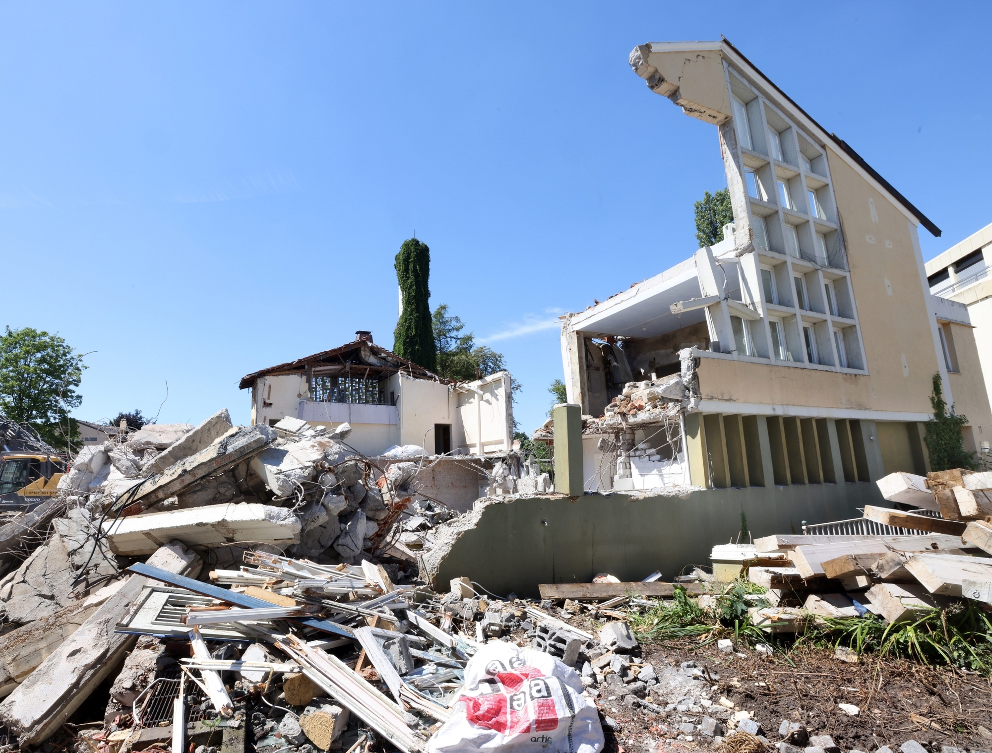 Nun ist es so weit – auf dem brachliegenden Hangweide-Gelände tut sich nach Jahren wieder etwas. Der Abriss hat begonnen: Der Bagger beißt sich krachend und staubend durch die Wände. Bei jedem Zupacken wird etwas von der Fassade abgebrochen, Teile fliegen scheppernd zu Boden. Von der Kirche des ehemaligen Diakonie-Dorfes, in der einst zahlreiche Menschen mit und ohne Behinderung zusammenkamen, sind derzeit nur noch Überreste zu sehen.