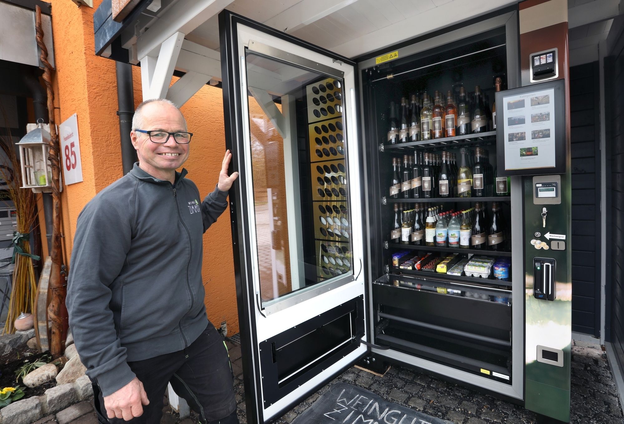 Wem zu Hause oder als Wanderer der Wein ausgegangen ist, der wird in der Frauenländerstraße in Stetten fündig. Die Wengerterfamilie Zimmer hat auf ihrem Hof einen Bio-Weinautomaten aufgestellt und preist ihn als „den ersten Bio-Weinautomaten im Remstal“ an. Das bestätigt auch Remstal-Routen-Geschäftsführer Werner Bader. Gemeinsam mit Bürgermeister Benedikt Paulowitsch begutachtete er den Automaten aus unmittelbarer Nähe.