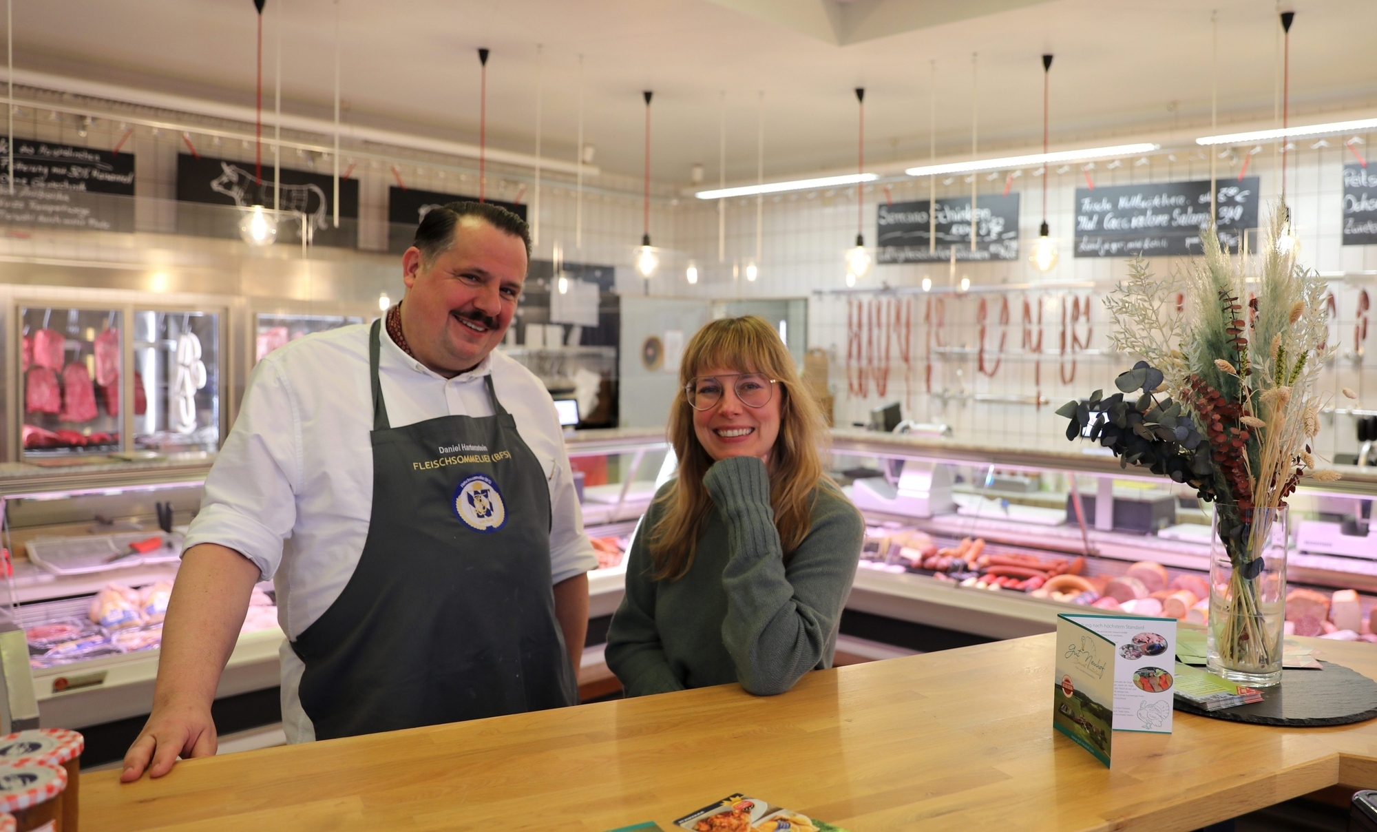 Die Landmetzgerei „Zum Ochsen“ wurde bereits zum zweiten Mal vom Fachmagazin „Feinschmecker“ zu den fünfhundert besten Metzgern Deutschlands gewählt. „Wir waren selber überrascht“, berichtet Inhaberin Ilka Jeggle. Dabei ist das nicht die einzige Veränderung, die es in der Metzgerei zuletzt gab: Jeggles Lebensgefährte Daniel Hartenstein hat seine Fortbildung zum Fleisch-Sommelier abgeschlossen. Während die berufliche Weiterbildung des gelernten Betriebswirts ein bewusster Schritt war, hatte