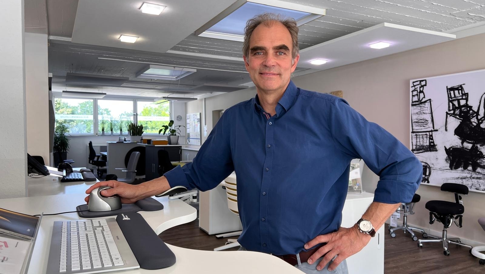 Lars Kuhn weiß, dass sein Geschäft in der Karlstraße in Kernen-Rommelshausen oft übersehen wird. Wer von außen durch die Glasfront ins Innere blickt, sieht nicht selten eine leere Verkaufsfläche. Schreibtische zum Stehen und zum Sitzen, Stühle und Hocker sind eben keine klassische Stöber-Ware. Doch darum geht es bei Lars Kuhn auch gar nicht. In seinem Geschäft Ergonomix, das sich neben der Bäckerei Emil Reimann befindet, berät er sowohl Privat- als auch Geschäftskunden. Ausschließlich im