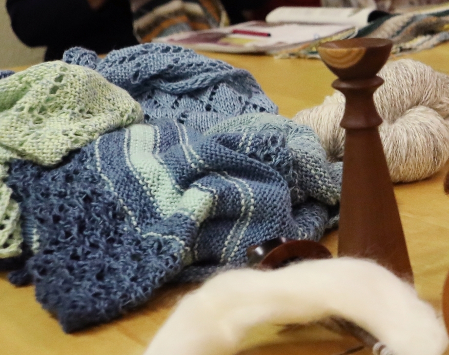 „Schwätzen und Schaffen“, das hat eben Charme für die Frauen. Einerseits, weil sie in der geselligen Runde zugleich ein geneigtes Publikum für ihre fertigen Filzpantoffeln, aufwendig gemusterten Schultertücher, Socken oder Wollkuscheltiere finden. Andererseits, weil sie sich gegenseitig Tipps geben und neue Kniffe zeigen können. Zum Beispiel, wie Wolle gesponnen wird.