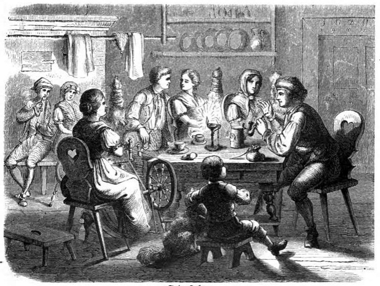 - Das Beisammensein sparte Kerzen und Feuerholz: Schließlich musste so nur eine Wohnstube ausgeleuchtet und geheizt werden. Weitaus unterhaltsamer war die Arbeit in der Gruppe natürlich auch: Die Frauen erzählten sich gegenseitig Neuigkeiten, Anekdoten und Gruselgeschichten oder sangen Lieder.